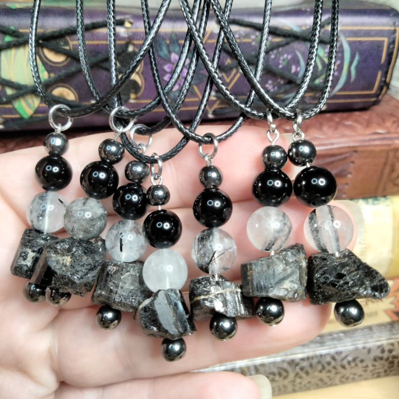 with raw black tourmaline, tourmaline quartz bead, magnetized hematite beads and black