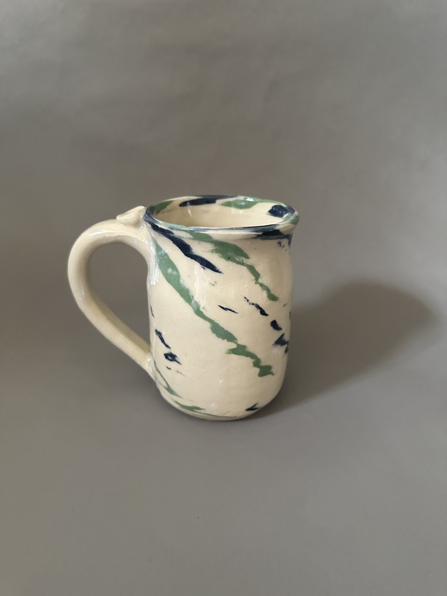 This cup was thrown on my potter's wheel with white and colored stoneware clay. I pull the handle is pulled and firmly attached on the cup for balance and grasp. I then cover it with a food safe glaze I make myself and highfire it in my kiln. Stands 4 & 1/2 inches tall and holds 12 fluid ounces of hot or cold liquid.