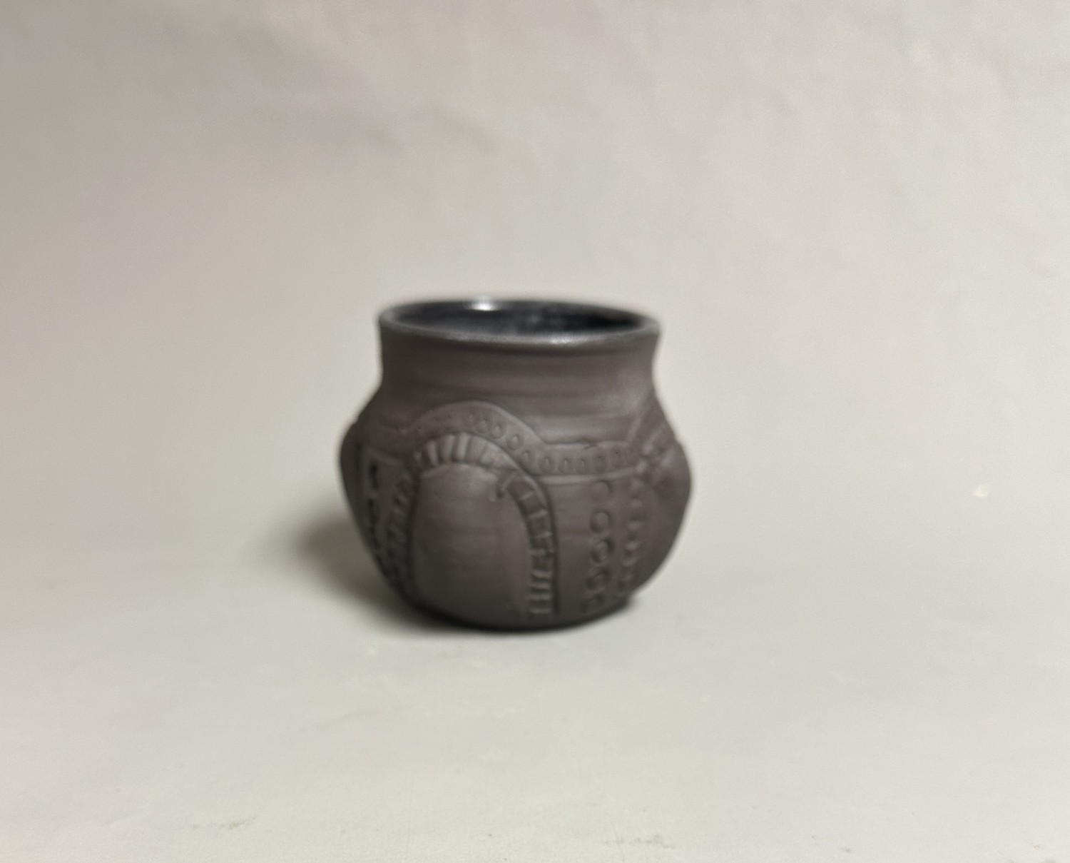 This rustic cup was made with carving, stamps, and “bosses” like the urns of the Anglo-Saxon Historical era. It is not exactly symmetrical , like the originals, but has the strength and handmade beauty of the originals. An important difference is a foodsafe glaze on the interior to make drinking from and clean up more pleasant.