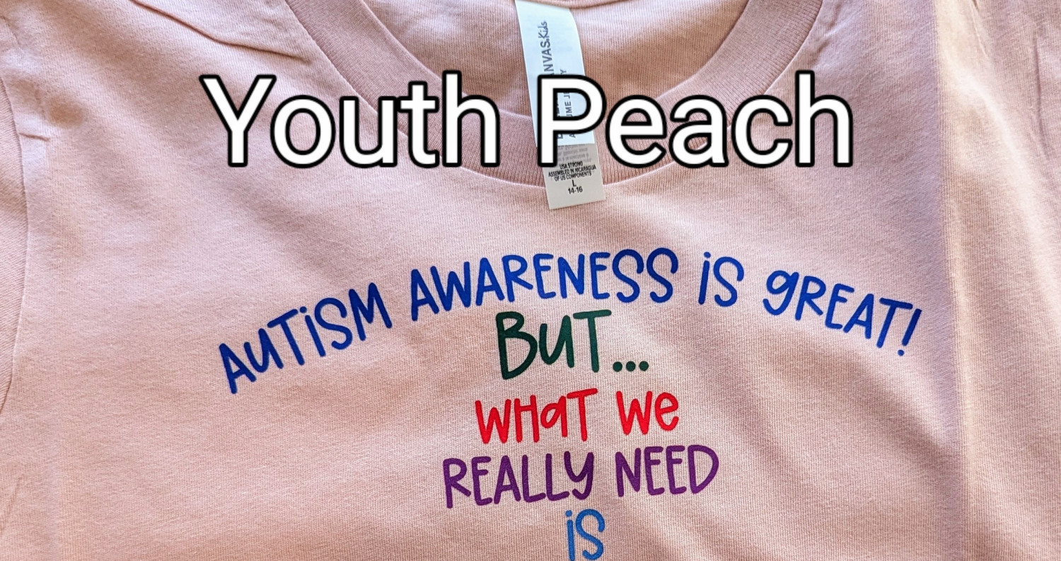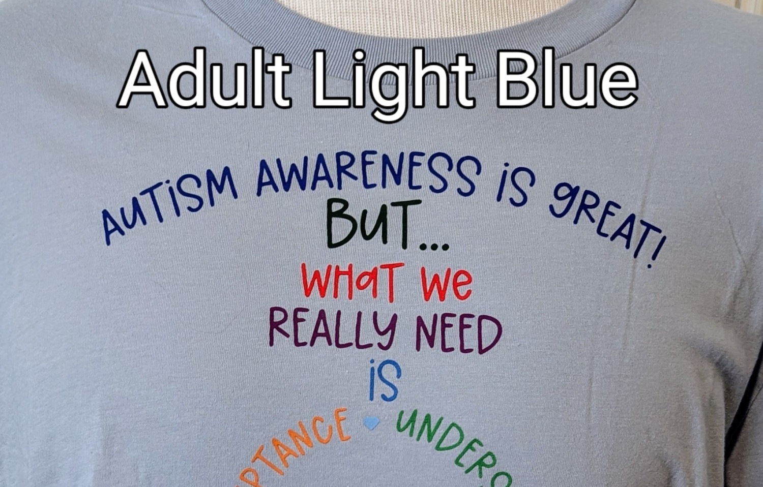 The shirt is a 100% cotton Bella+Canvas short sleeved crew neck in unisex sizing. I selected this brand because I find it very sensory friendly. It is 100% pre-shrunk incredibly soft cotton with tear-away tags, and is very reliable in sizing and quality.