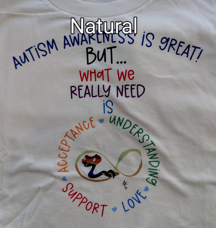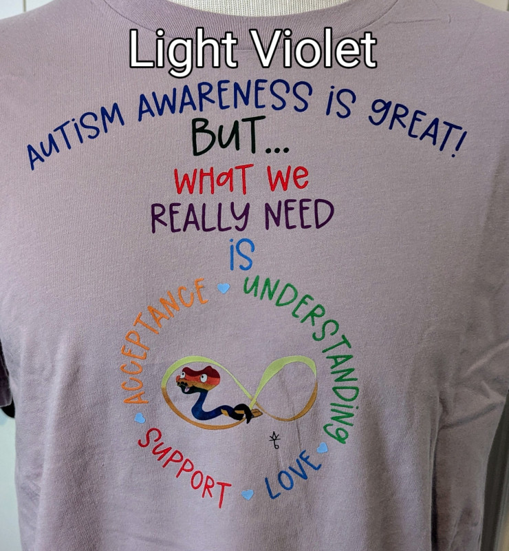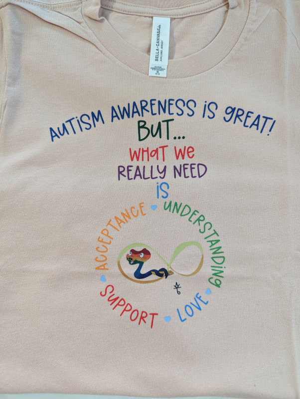 This exclusive design features my original design featuring my art showing a snake within a gold infinity symbol promoting autism awareness and acceptance. Our logo is on the back of the shirt under the neckline.