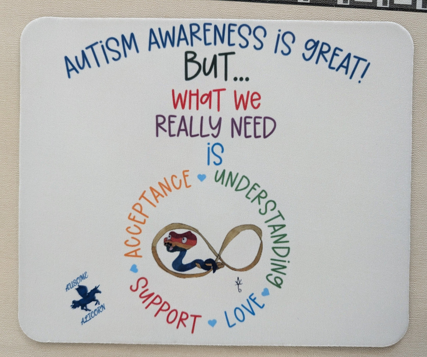 Round neoprene Mousepads showing our exclusive Autism Acceptance designs featuring original art by Ausome Alicorn! There are several designs available, so be sure to check them out, as well as other non-Autism Acceptance designs available in our shop. Mousepads are standard sized. The round mousepads are approximately 8" in diameter.