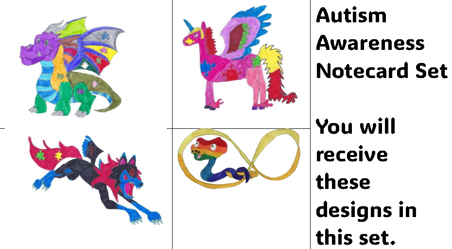 This notecard set features original art by autistic artist Ausome Alicorn. This notecard set features four different autism creatures combinations. We offer this as a set of four with all the different designs or a set of four of each individual design. If you would like a different combination of designs or quantities, we offer each of our cards as singles in a separate listing, or just message us! Our logo and design name ore printed on the back of the card. Be sure to check out my other notecard designs!