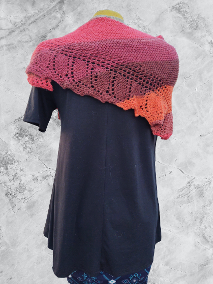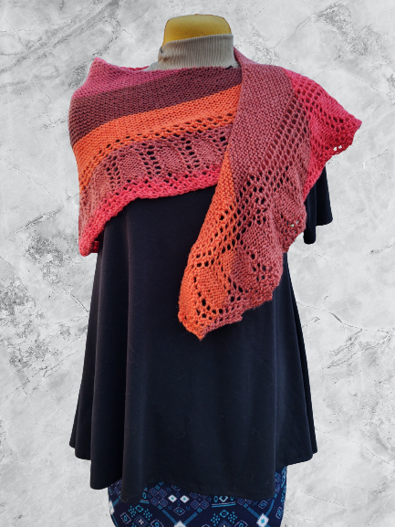 Elevate your wardrobe with the "Autumn on Magrathea" Shawl, a hand-knit masterpiece that captures the fiery glow of an alien autumn sky. With its rich, gradient hues—ranging from deep plum to burnt orange and blush rose—this asymmetrical shawl is as imaginative as the name suggests.