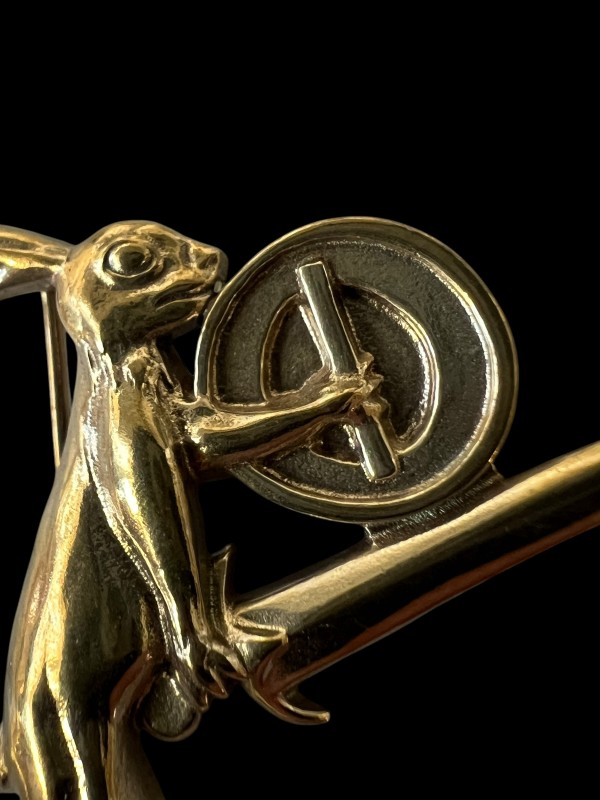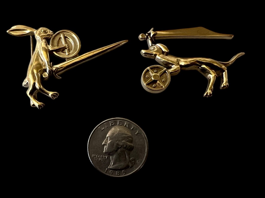 This one was found in a 14th century manuscript, where this guy fights against a hound, similarly armed. For those sword and buckler or I.33 enthusiasts, this may be one for you! You can wear him alone, with the opposing hound, or with our matching sword and falchion bunny, drawn from the same manuscript.