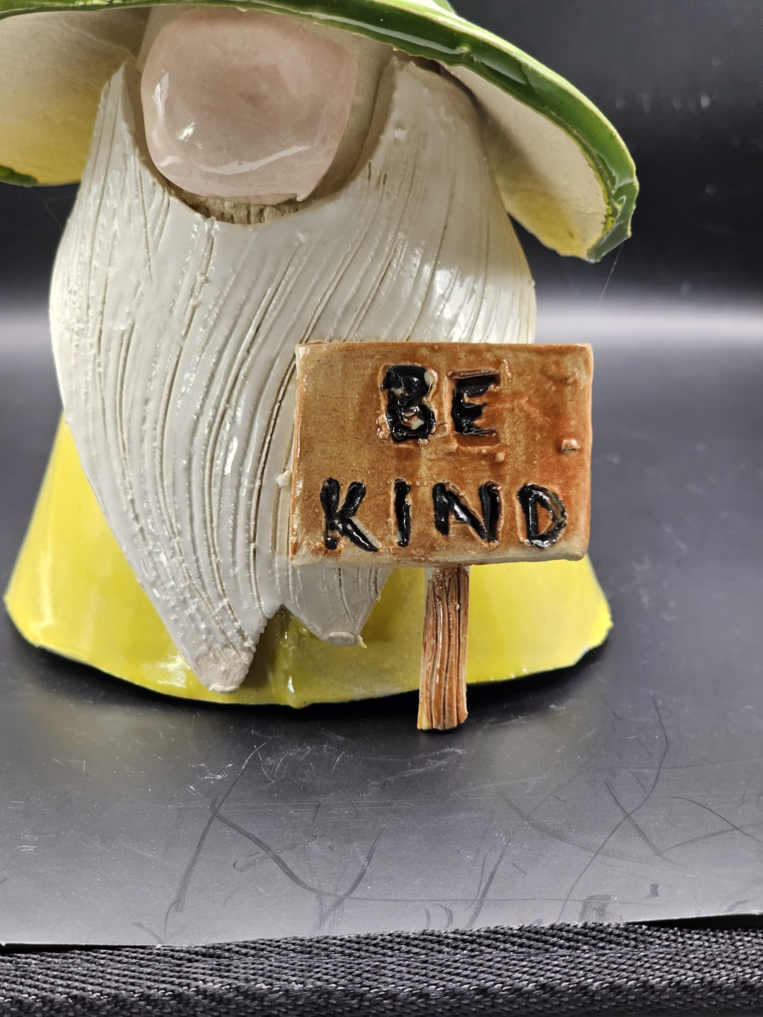 This gorgeous gnome wants to grace your garden or home! He has a yellow cloak, a lime green hat, a blue bird on his hat and a sign reminding all who are near him to be kind.