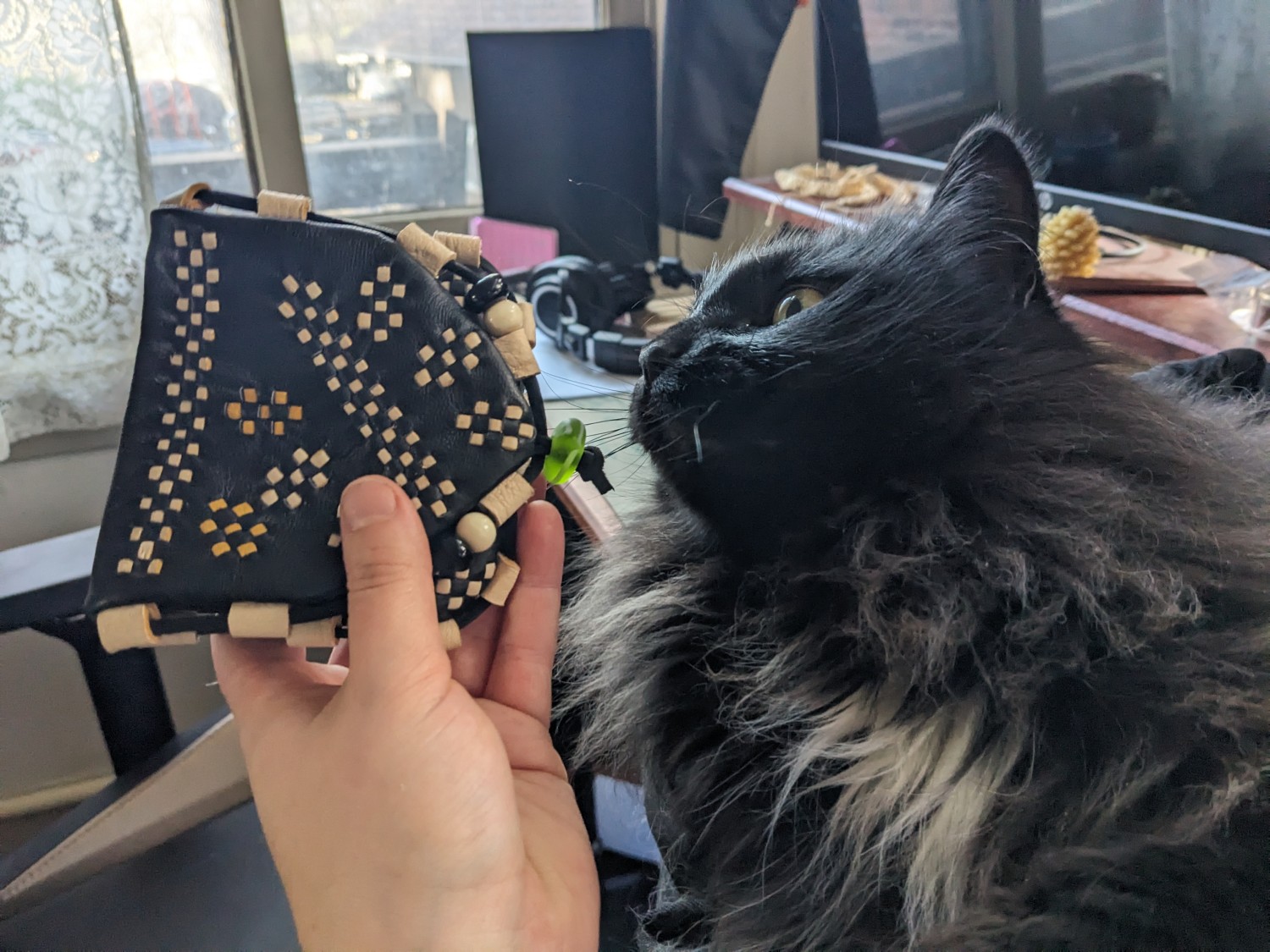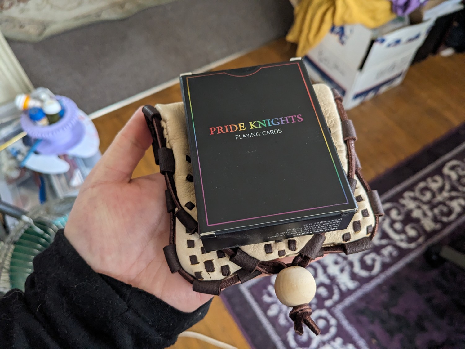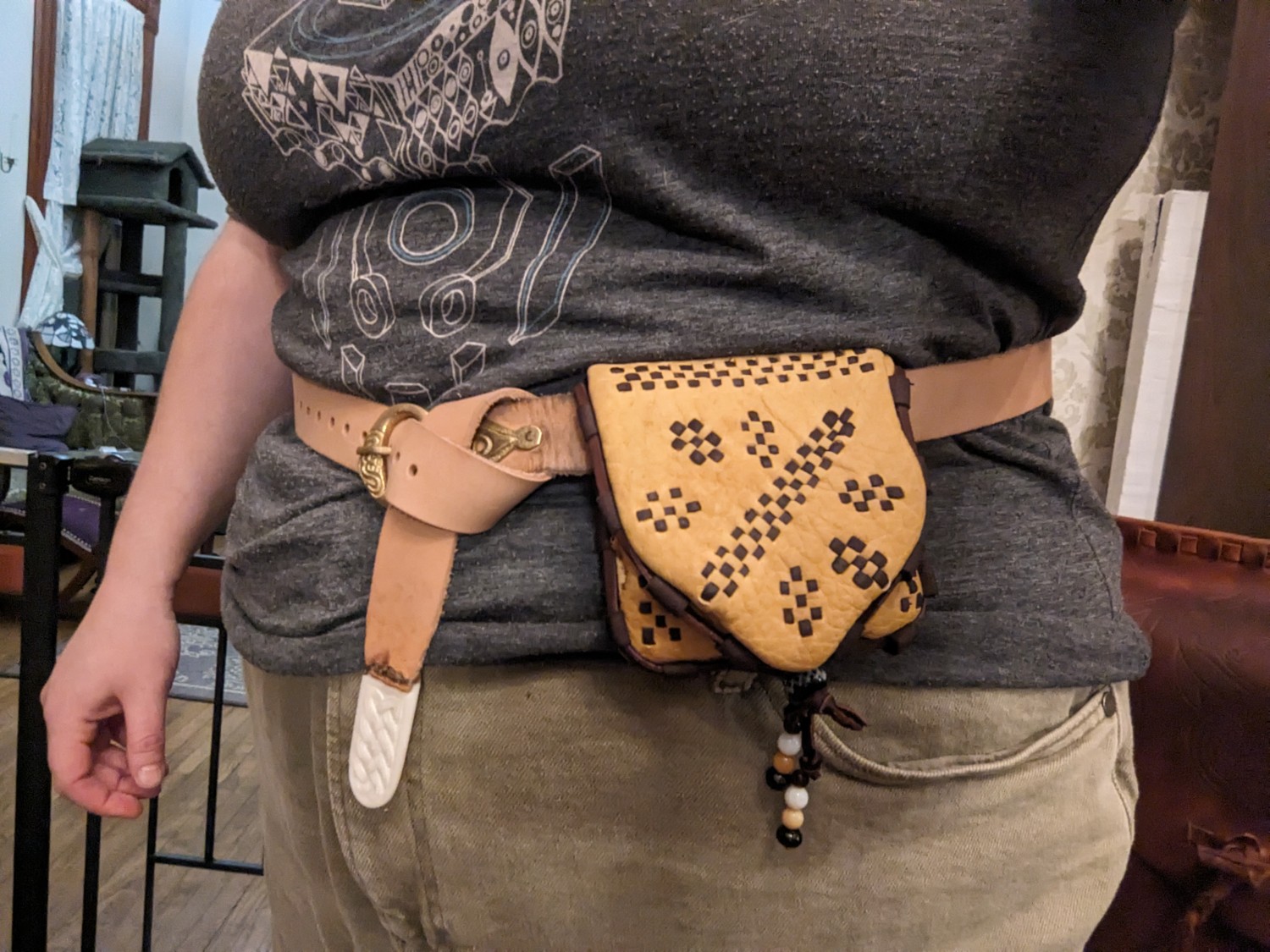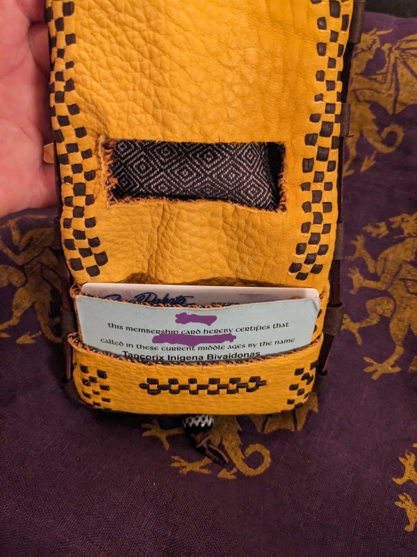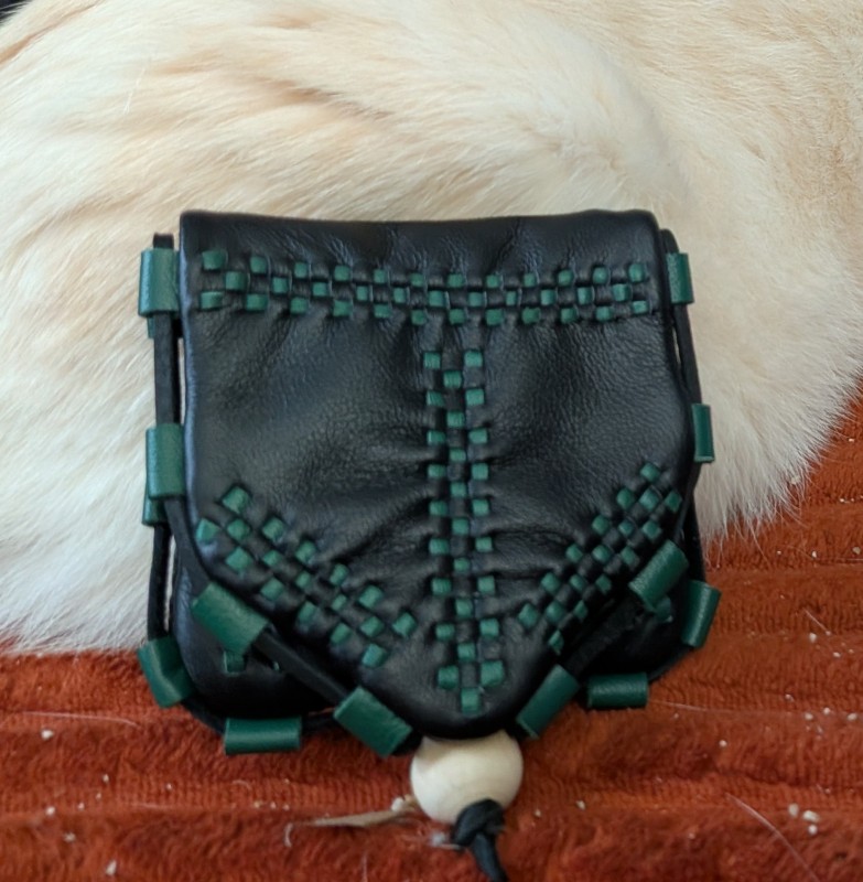 Made to order Birka wallets from Birka Grave 750. This wallet is a lovely little object that is just perfect for Viking reenactors, merchants and more. The pockets hold a modern credit card perfectly despite being designed for hacksilver and trade weights. The roomy interior can be reached through a horizontal slot and makes an excellent coin pouch. Each wallet is made of 2-4oz deer, lamb or calfskin with hand-cut decorative chisel-punched lacing in a contrast color of your choice, a deerlace cord surrounding the perimeter of the wallet, and a decorative wood, bone or glass bead to act as a toggle closure. The interior stitching of each wallet is hand punched saddle stitching with .6mm linen thread.