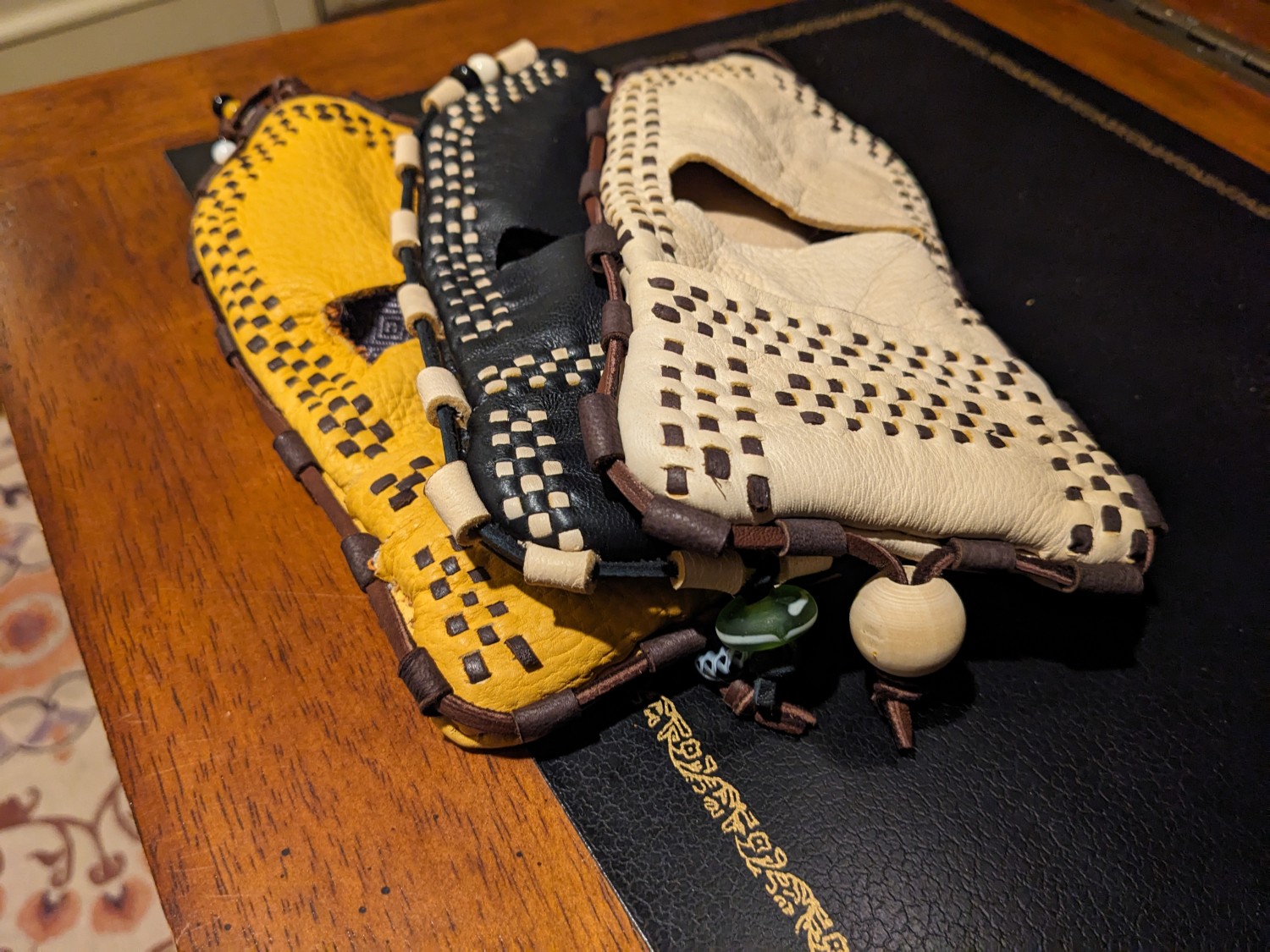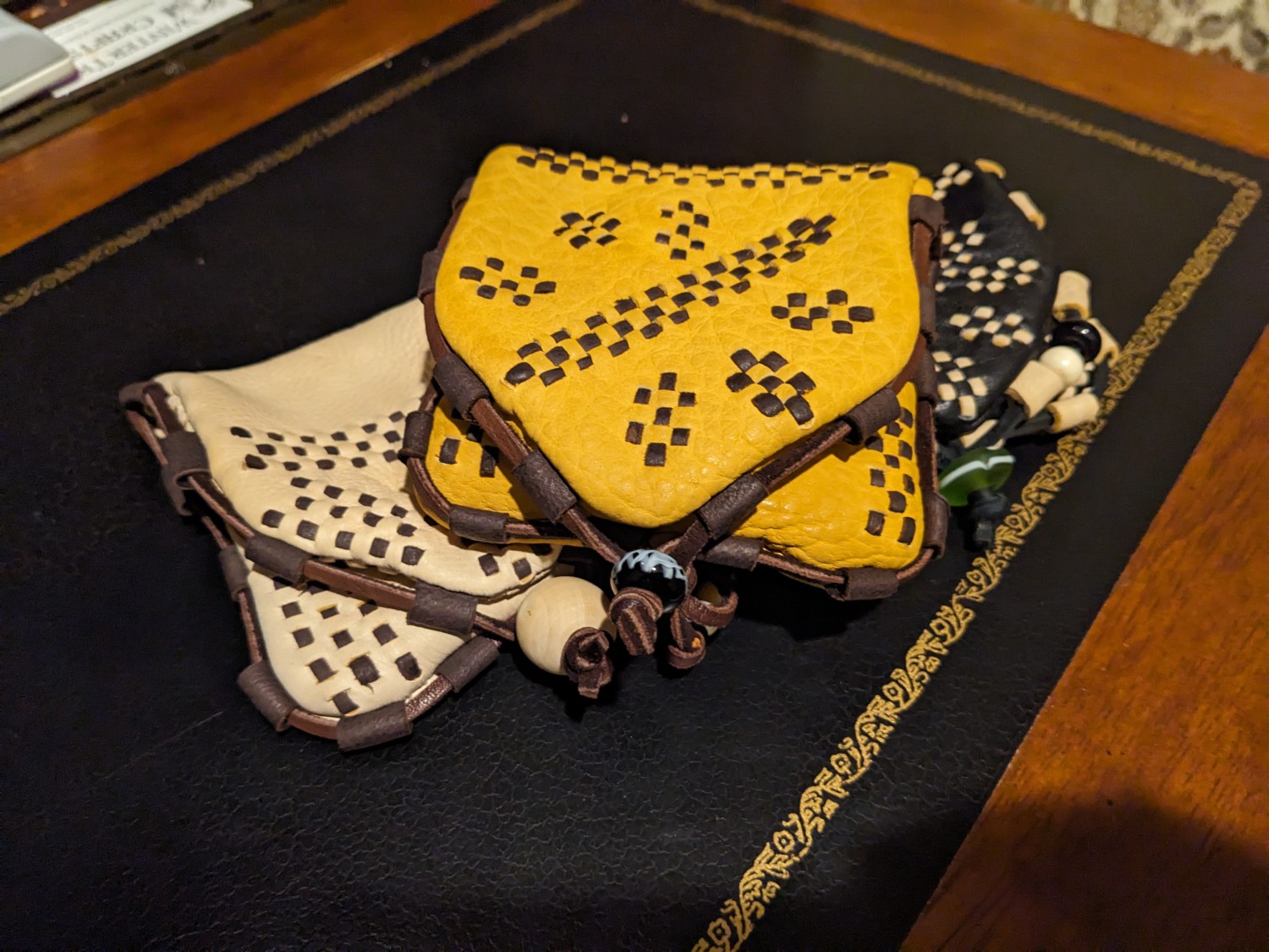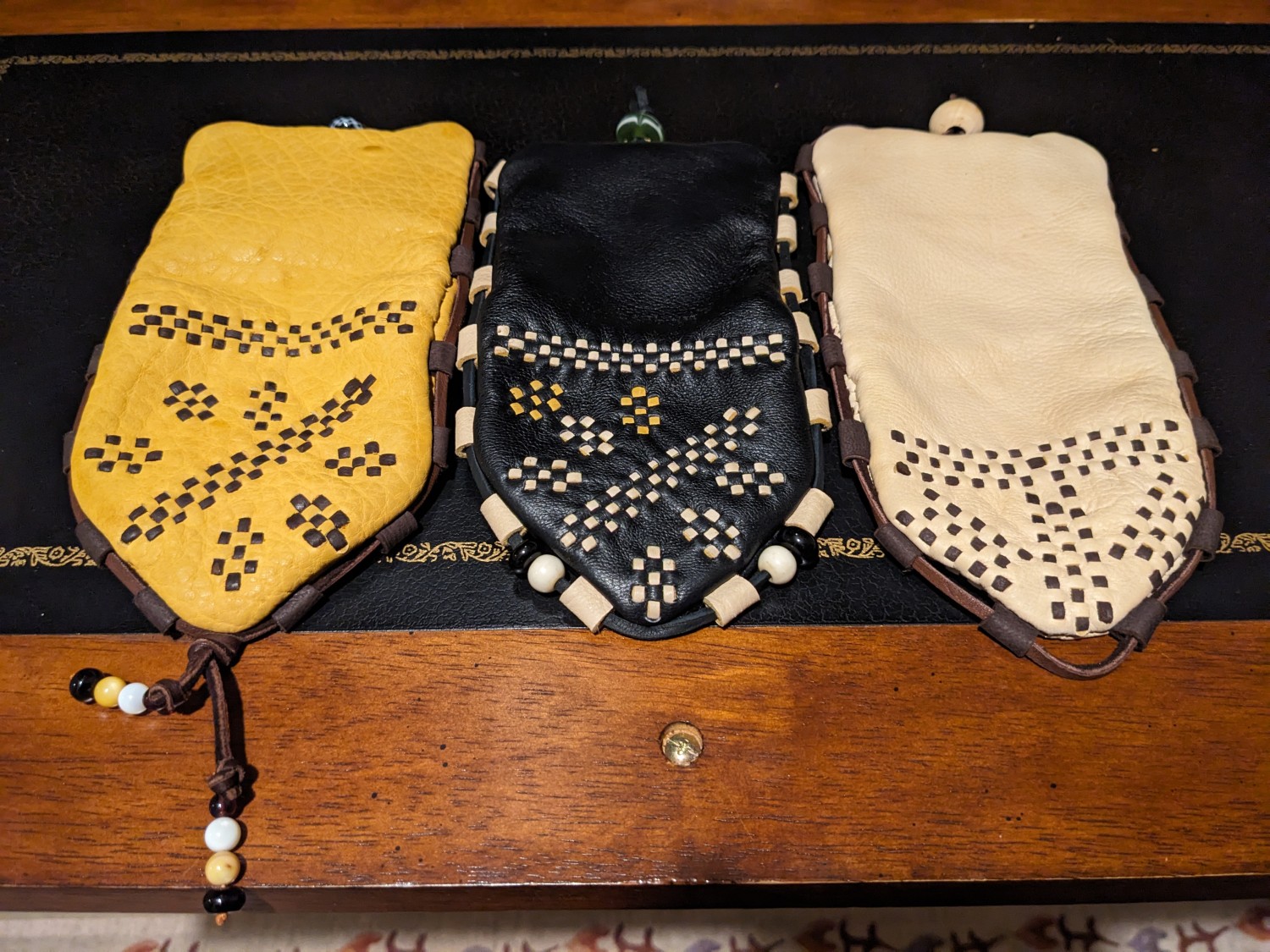 I currently have seven colors available for both the body of the wallet and the decorative chisel-punched lacing: ivory, gold, black, chocolate, tobacco (listed as SaddleBrown), eggplant (listed as Purple) and pine (listed as ForestGreen). After you order, I will message you to confirm the contrast lacing color and bead closure options. If you would like a leather color not listed here, message me and I can talk through options of colors available at Tandy and The Leather Guy. All wallets will come default with the overall lacing layout of the ivory wallet in the listing pictures, which I call the simplified TV pattern. The lacing itself will be much tighter like the gold and black wallets, but the starburst/compass pattern of those two is not available. Additional bars of lacing can be added for $10 to $25 depending on complexity. A full recreation of the original Birka wallet adds four long bars of lacing for a total price of $200. If additional lacing is requested, I will send you a hidden listing for that purchase.