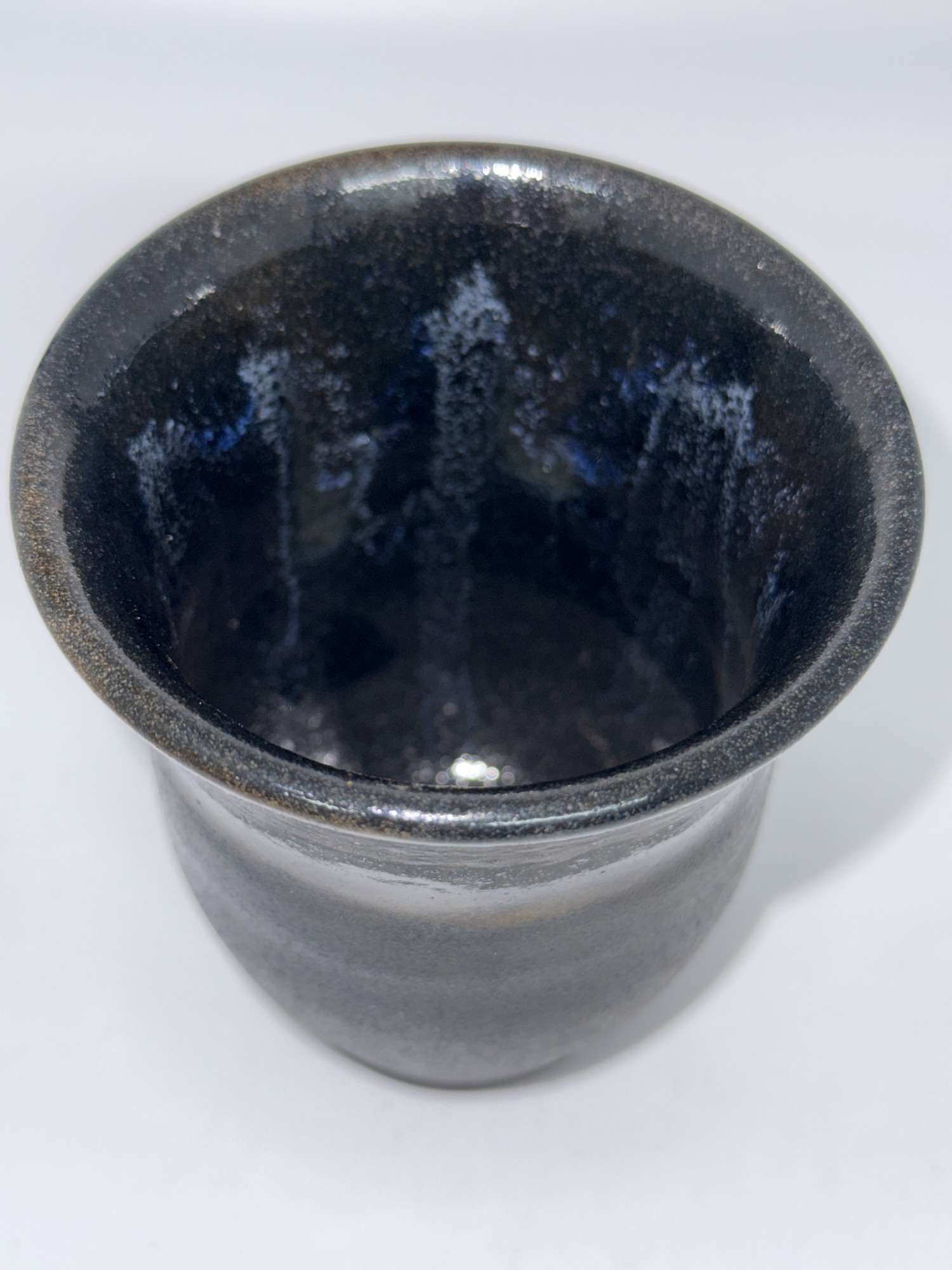 Black Cup, Blue drips on interior. 3.5x4"