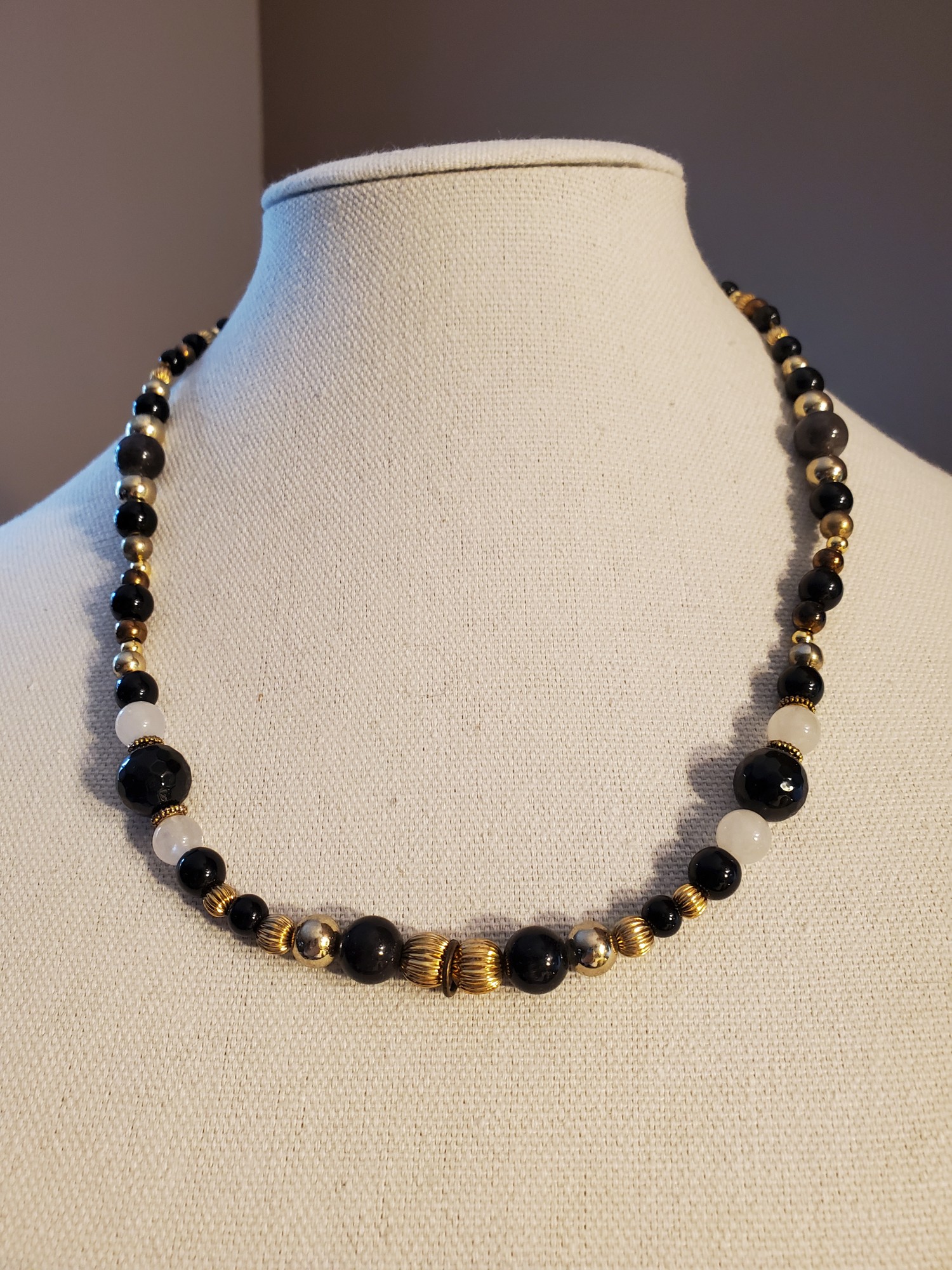 Black&White Necklace, Onyx, Agate, Rock Crystal in gold plated Findings, 20" long