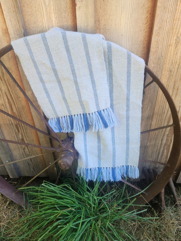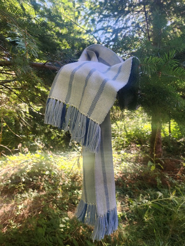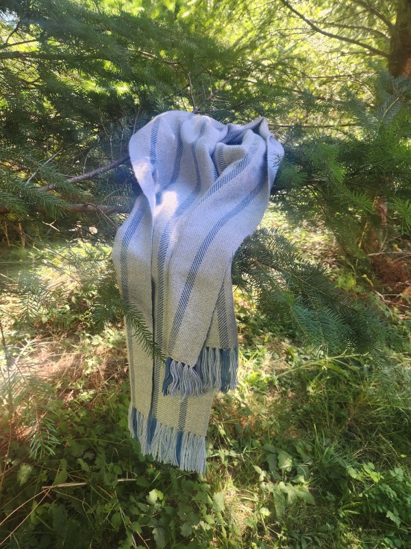 This super soft multi-tonal blue warp with grey weft narrow shawl or scarf is handwoven by me, on a traditional floor loom in 50% Alpaca, and 50% wool. Woven in a broken diamond twill pattern. Blanket stitch on the fringe makes a nice decorative edging. The wool stops the Alpaca, spun in Peru, shedding a bit. Slight variations in weave may be seen, due to being handwoven vs machine woven perfection.