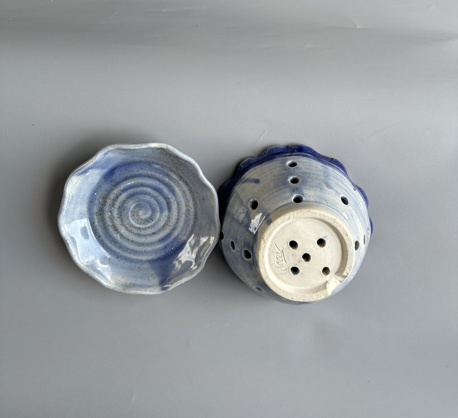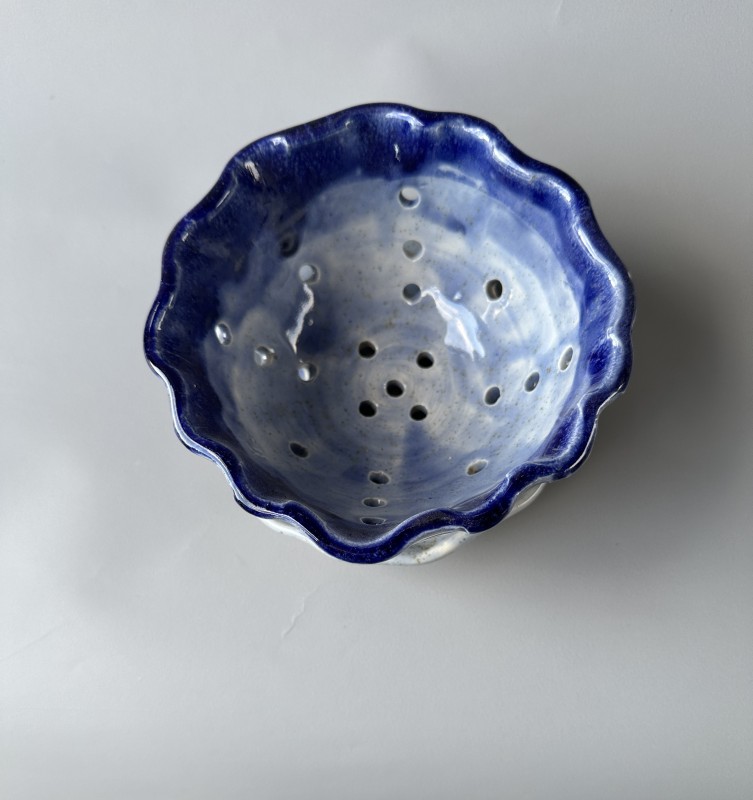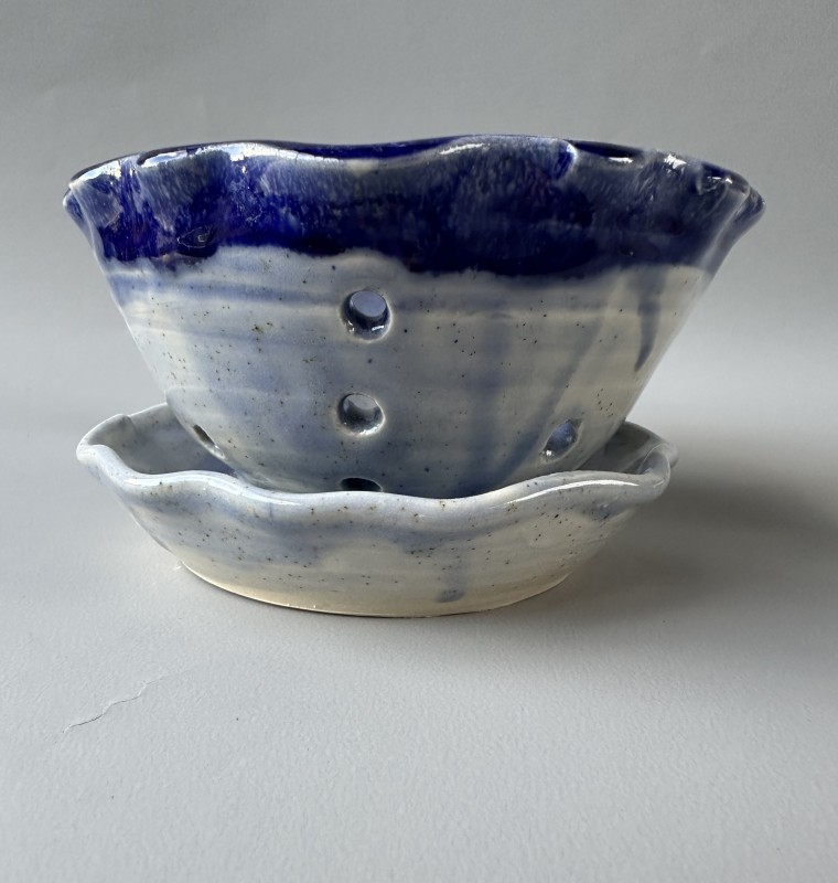 This handmade blue pottery bowl will look stunning whether you use it to hold fresh berries, or if used as a colander...then it doubles it's usefulness. The hand drilled perforation allows the liquid to drain through while holding the foods inside. The difference with this bowl is that the bowl and the saucer are separate for convenience in serving, draining and washing.