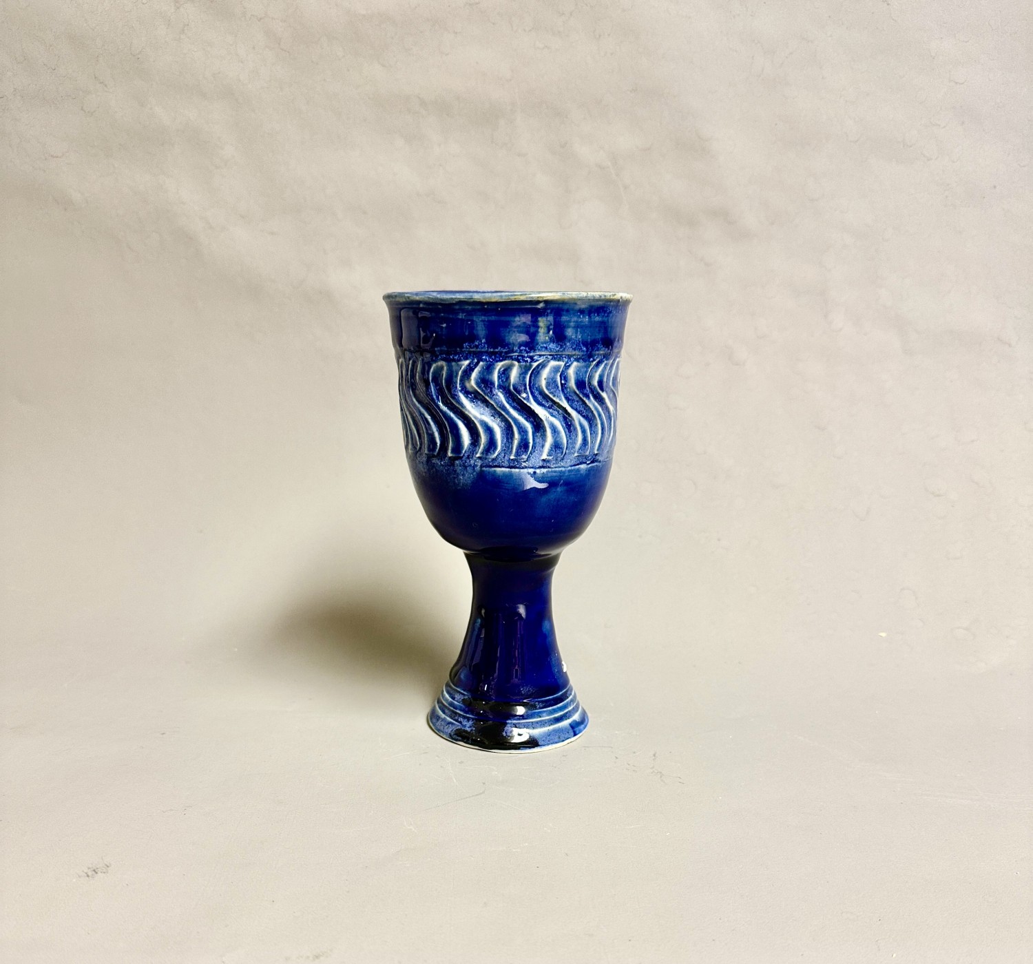 This goblet was thrown on my potter's wheel, and hand carved with a unique design. Then after being bisque fired once I glazed it with a jewel-like, food-safe glaze, over hand carved abstracted designs. I mixed these glazes myself. Then was fired to stoneware temperatures.