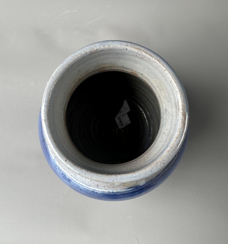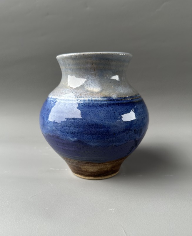 It is about 6in. tall, with a strong, round shape.It was made on my potter's wheel of stoneware clay, then covered with blue glazes which I also hand made.