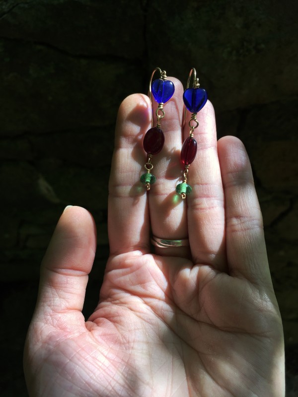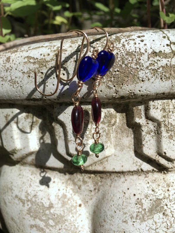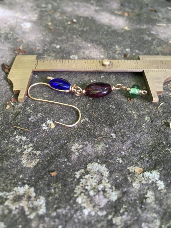 These earrings were based on one of my favorite extant ancient earring styles, British Museum 1867,0508.463, dated to the 2nd-3rd centuries CE. These reproductions were made using glass beads and bronze wire, and measure just a smidge longer than the originals, at about 2 1/2 inches long.