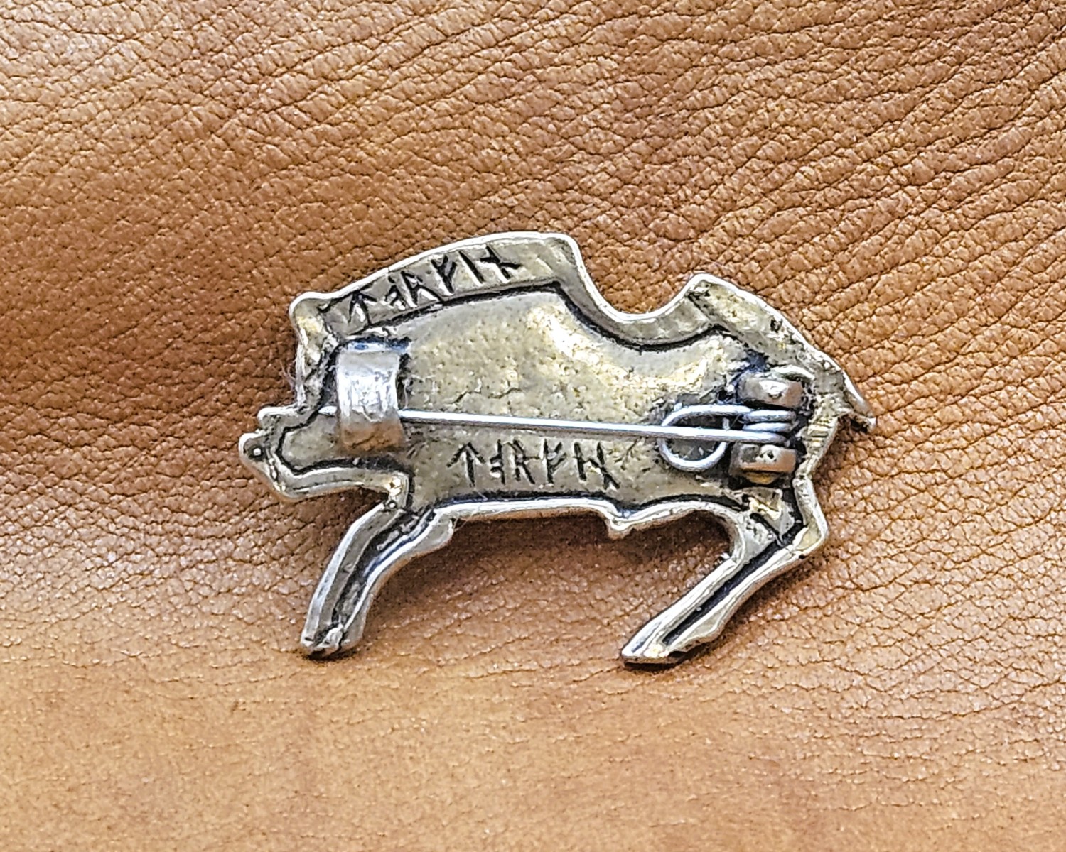 Description: Boar brooch - 1st-2nd century British-Romano. Based off enameled original with a stainless steel pin