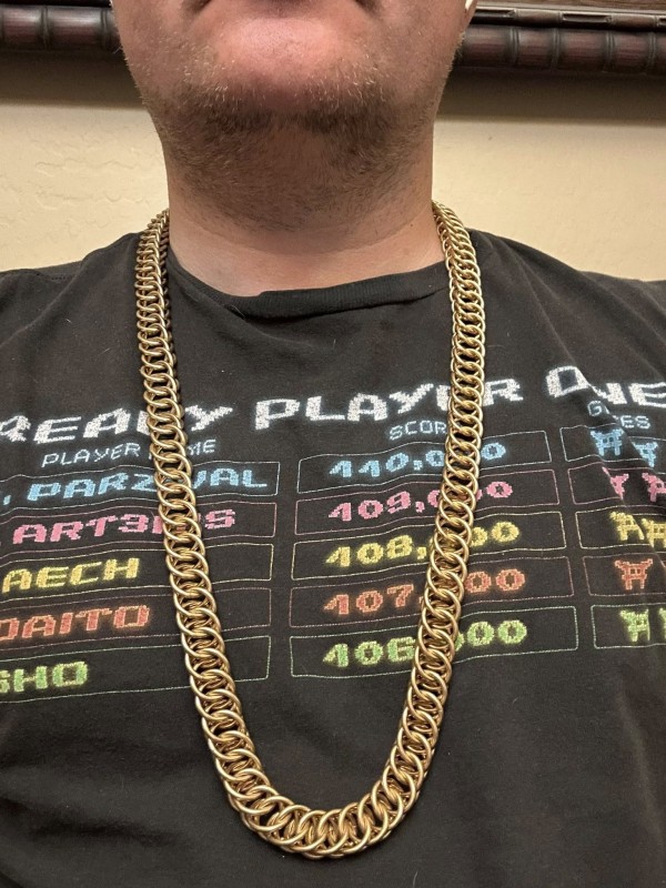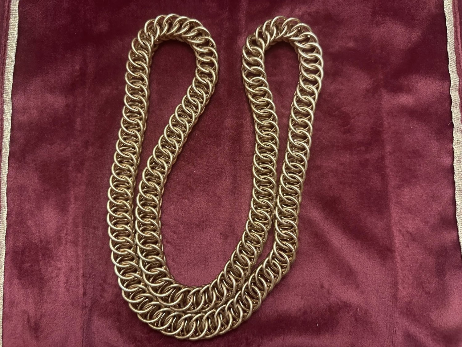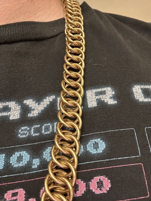 This striking 4/1 persian chain lays flat and comfortable.  In 14 gauge brass it is present but not in the way.
