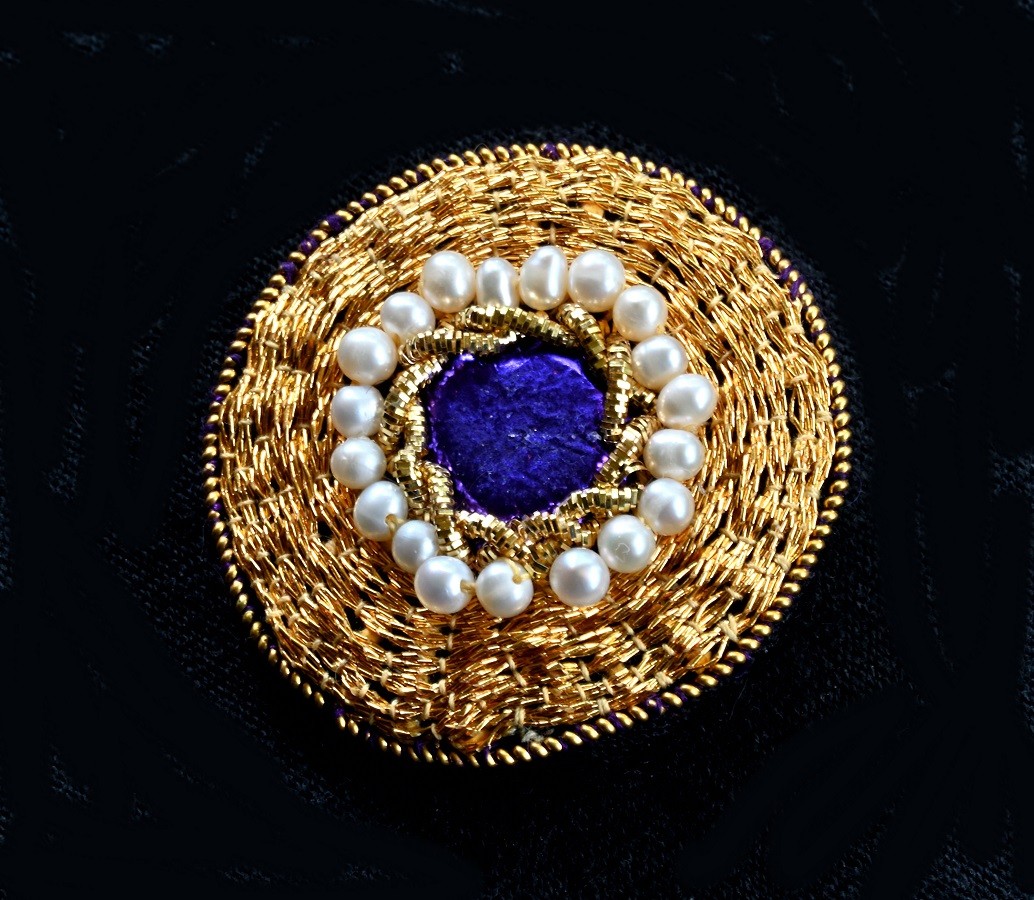 This brooch is a dramatic span of couched gold-colored thread edged with pearl purl. The center features pearls, gold-colored wire accents, and purple kid leather.