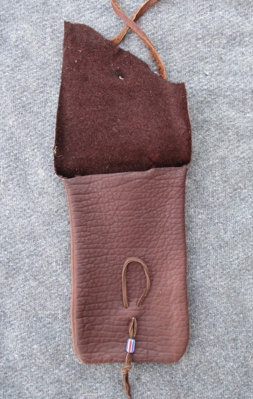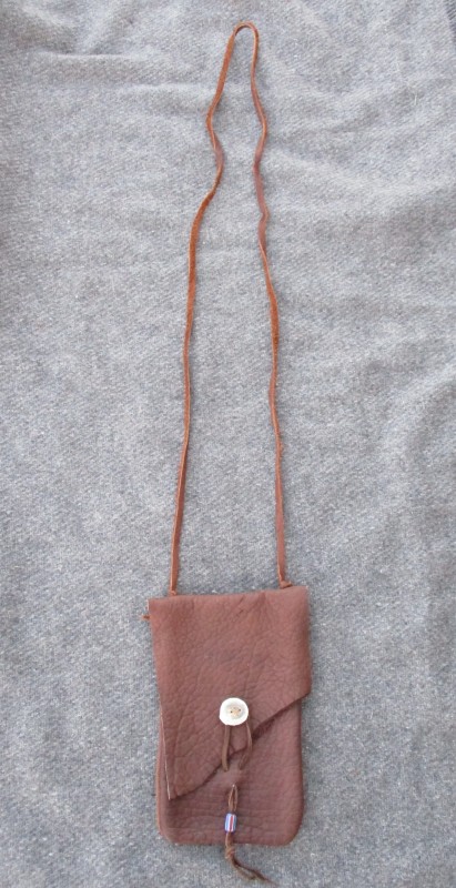 hide. The pouch is finished with a button-and-loop closure and