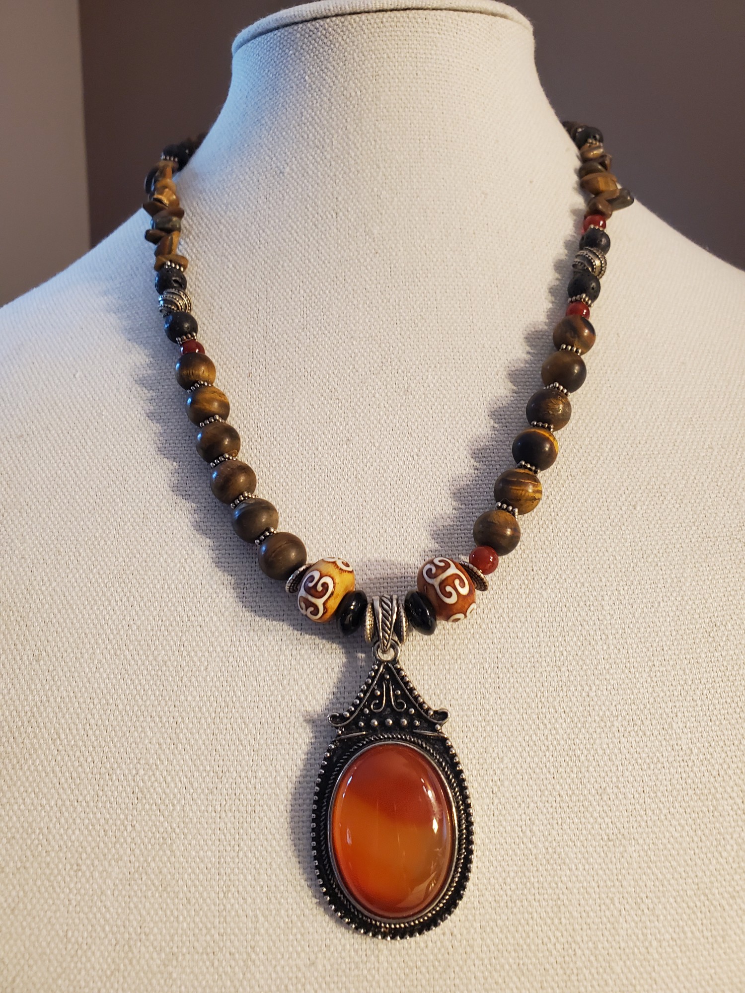 Carnelian Sunset, Tiger Eye, Onyx, Carnelian and Tibetan Silver, One of a Kind, 20" long