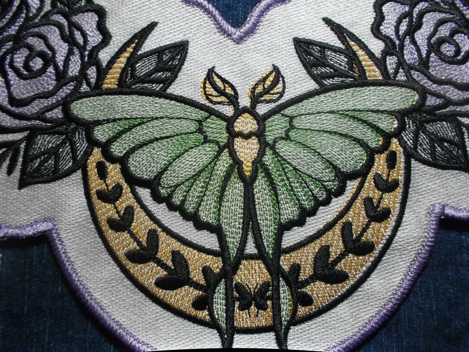 Add a touch of mystical flair to your clothing with this celestial patch! A striking Luna moth surrounded by roses and stars makes a bold design perfect for the back of your favorite jacket, or sweatshirt.