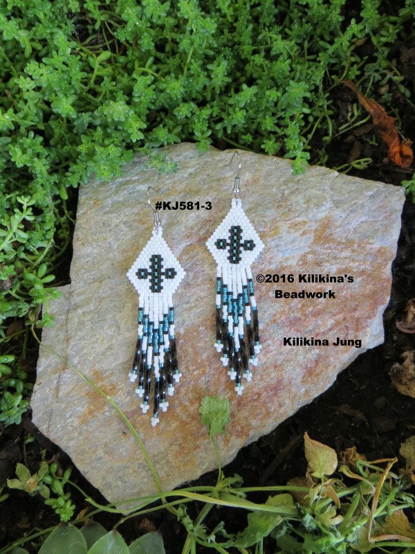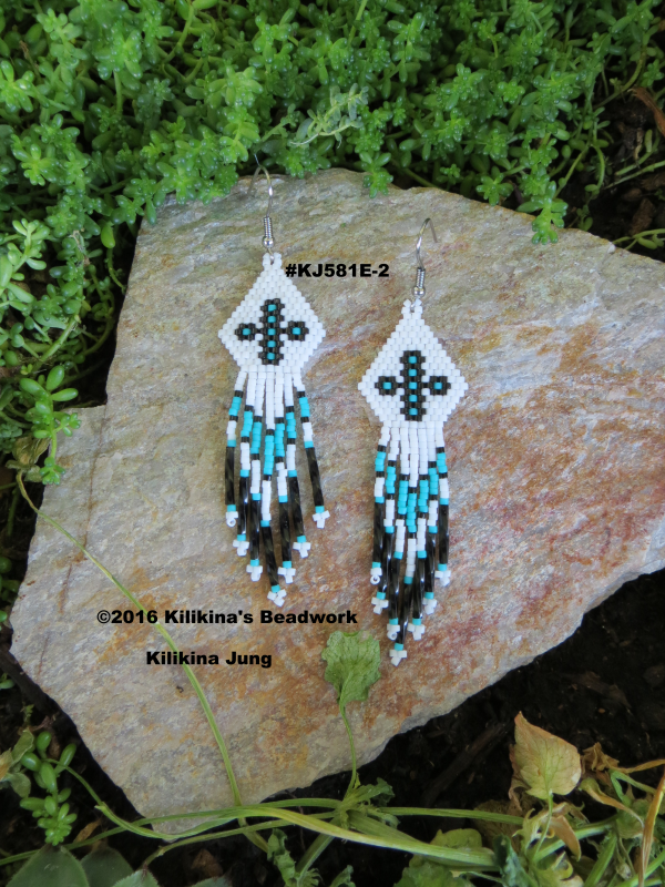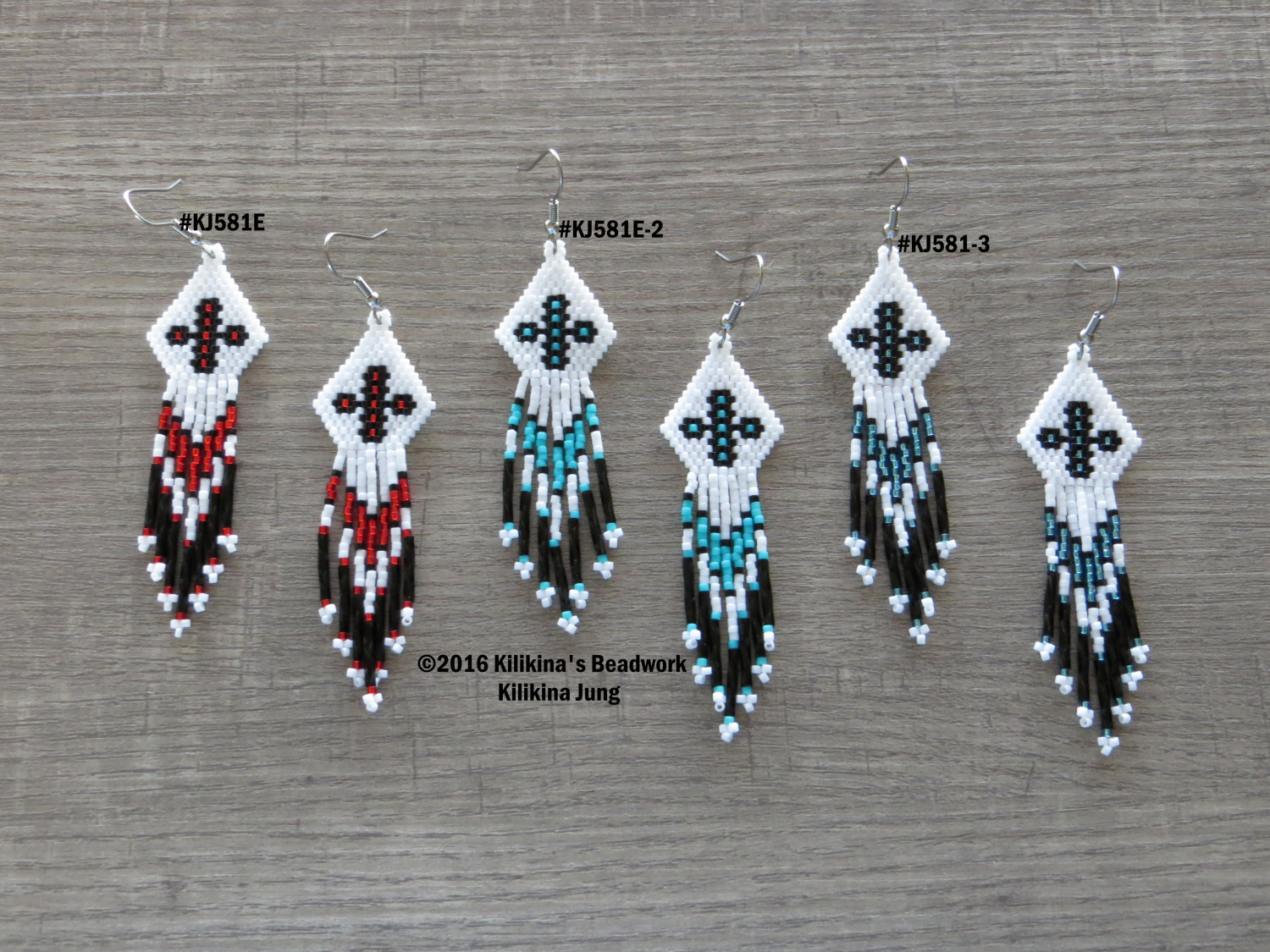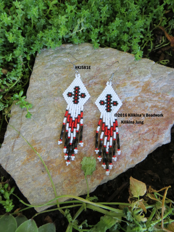 These beautiful earrings are made of Delica seed beads - they measure about 1" wide and about 2 3/4" long (not including the hooks). The measurements are estimated. The beadwork is hand sewn. These earrings are currently on stainless steel fishhooks. The fishhooks can be changed to posts or clips if requested. Buyer must request the change by message, before or when the item is purchased, as for I need to make any changes before packing and/or shipment.