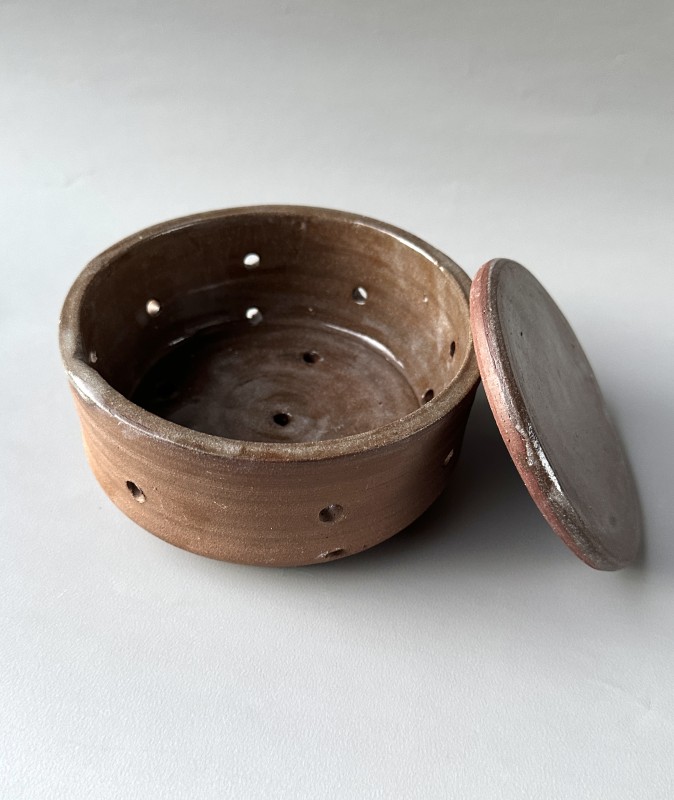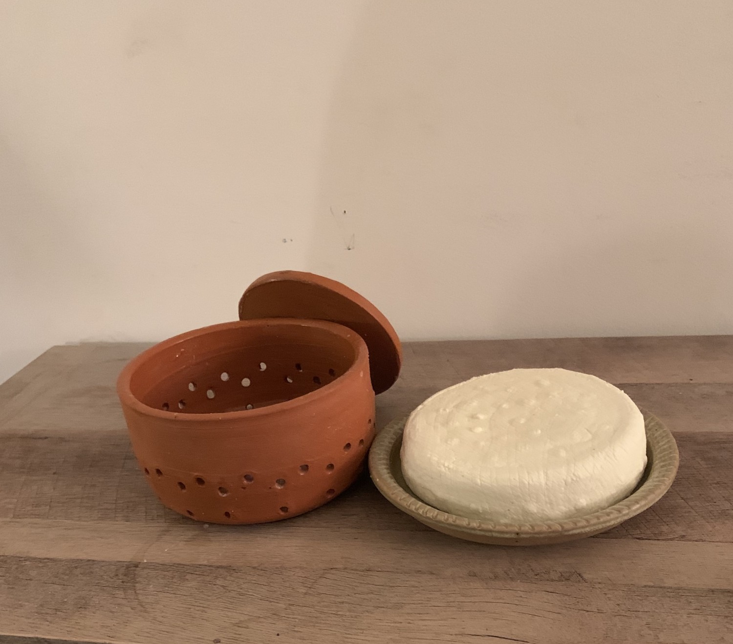 Stoneware cheese mold. Holds curds from 1 gallon of milk. Includes a flat plate for weight to press the cheese. The holes in the sides and the base will let the whey drain off. The last photo shows a different cheese mold that was used with 1 gallon of milk as an example. This listing is for the cheese mold in the first 2 photos.