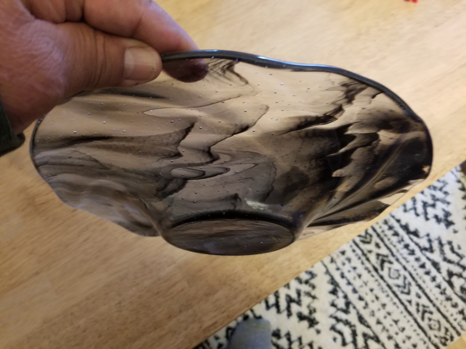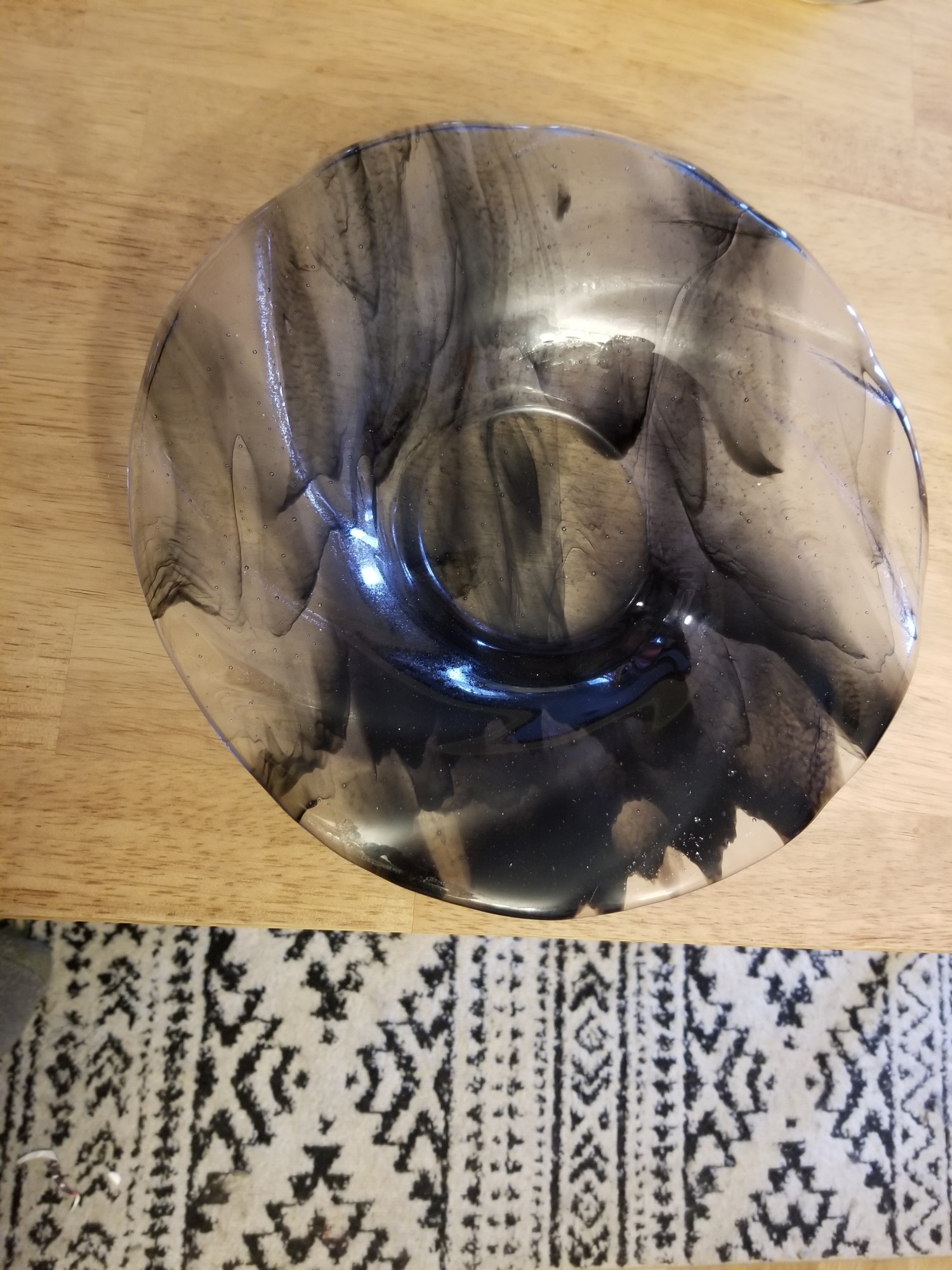 Create in our workshop by Donna. A black and clear swirled plate of Bullseye glass fused to a clear layer. The two layers were cut then fused. Refined after the first heating, then slumped into its final form here in a second firing.