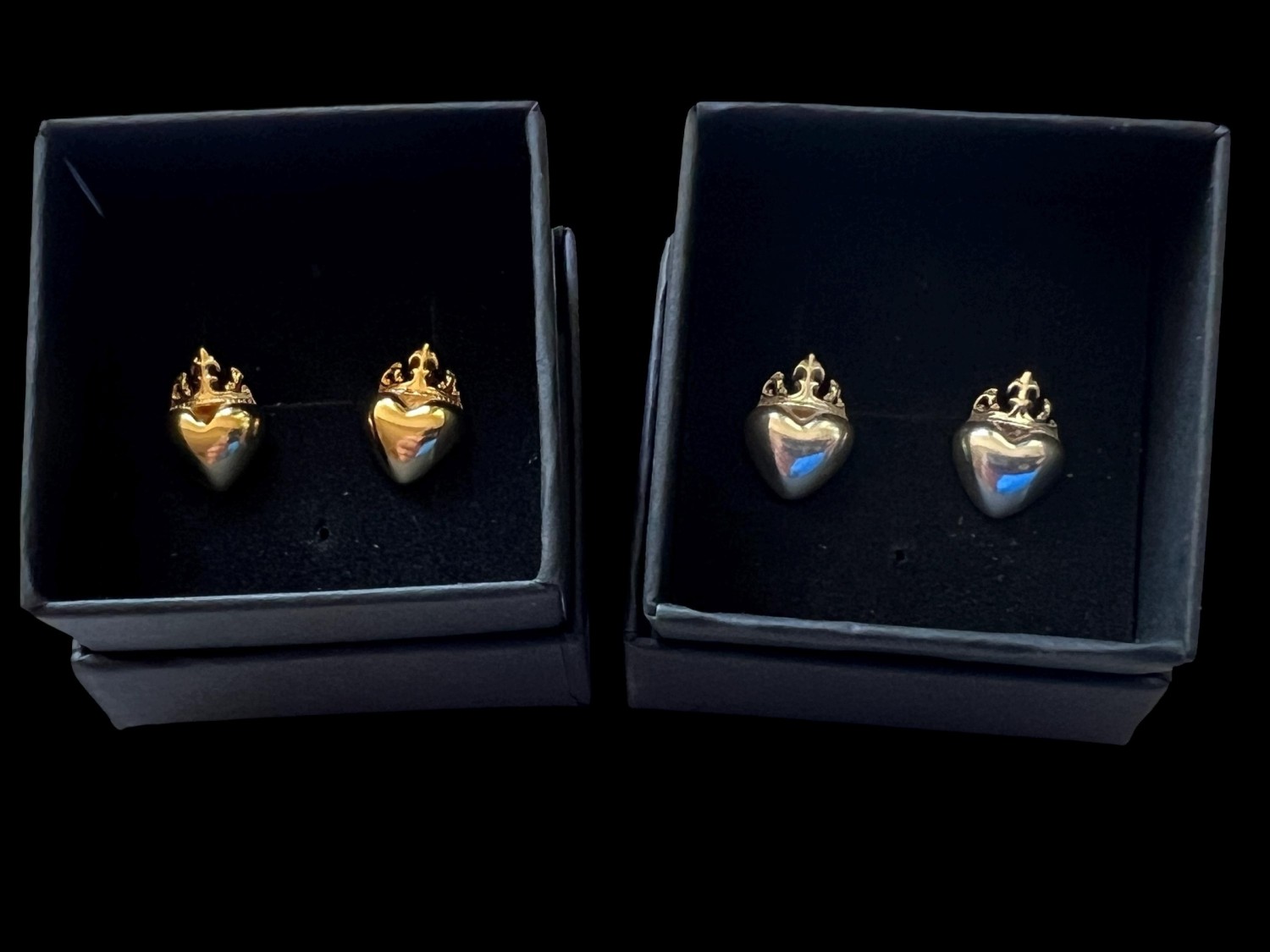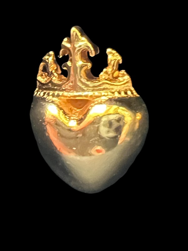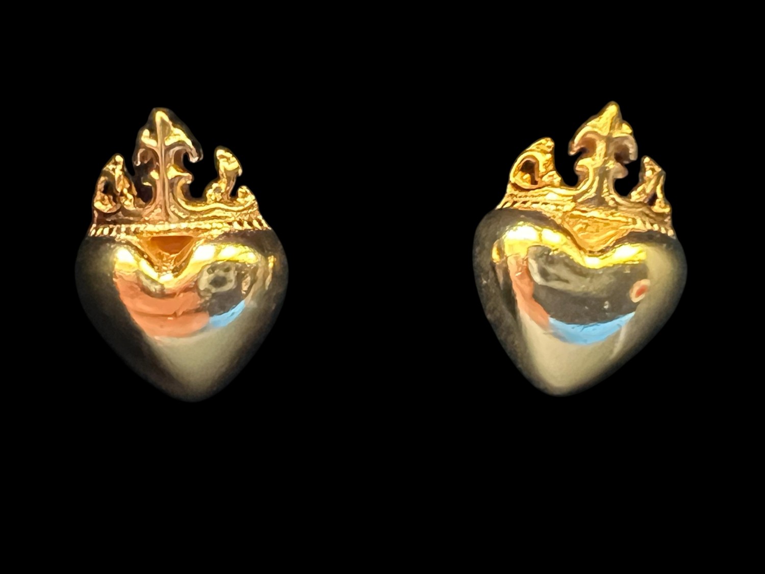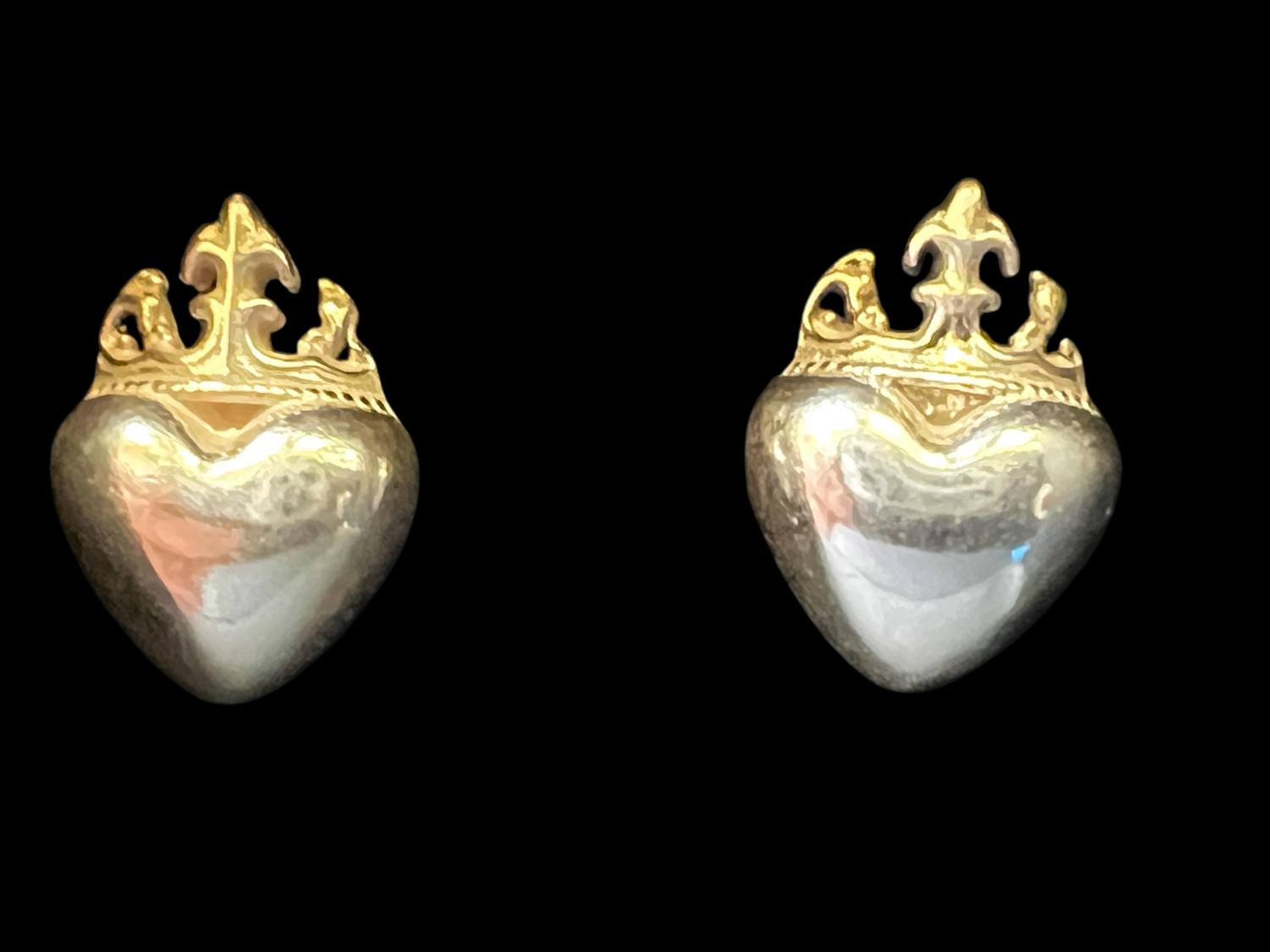 Sterling silver medieval-style post earrings featuring a well-modeled heart surmounted by a medieval crown. The perfect way to suggest that he or she has captured your heart!