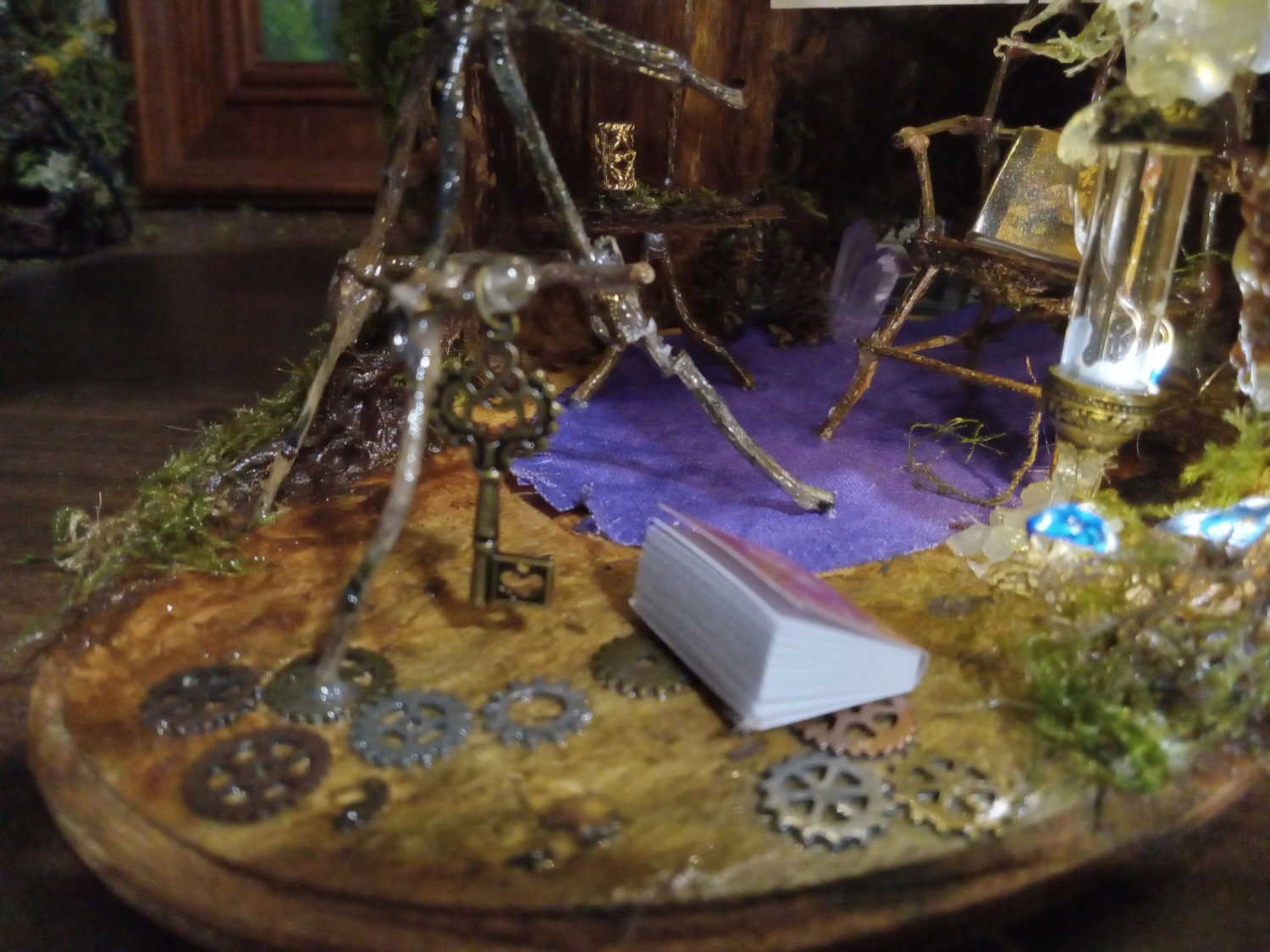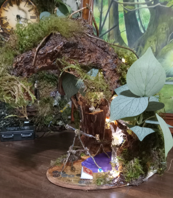Materials: Curly willow, crystals, LED lights (battery-powered unless you prefer otherwise), live moss, and delightful extras