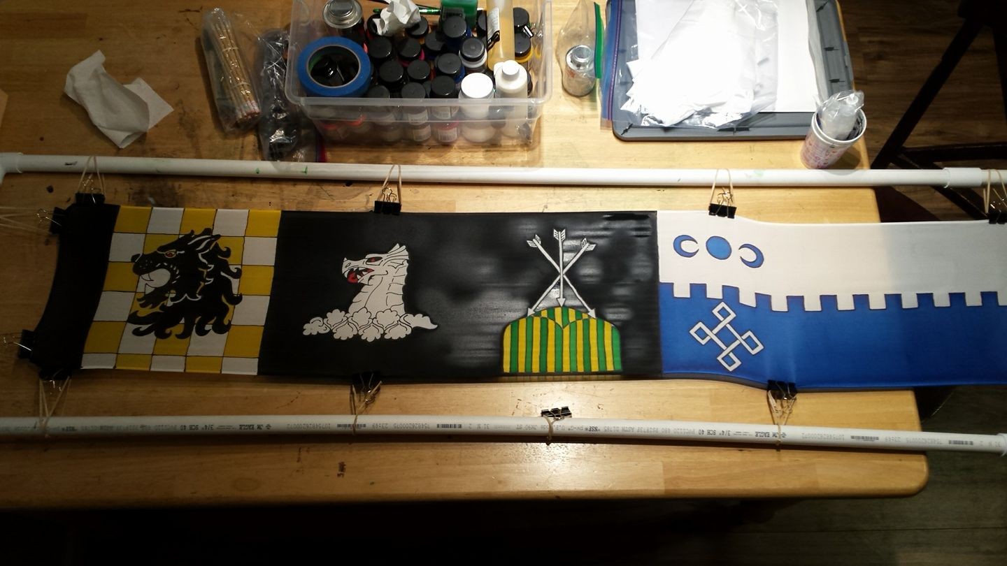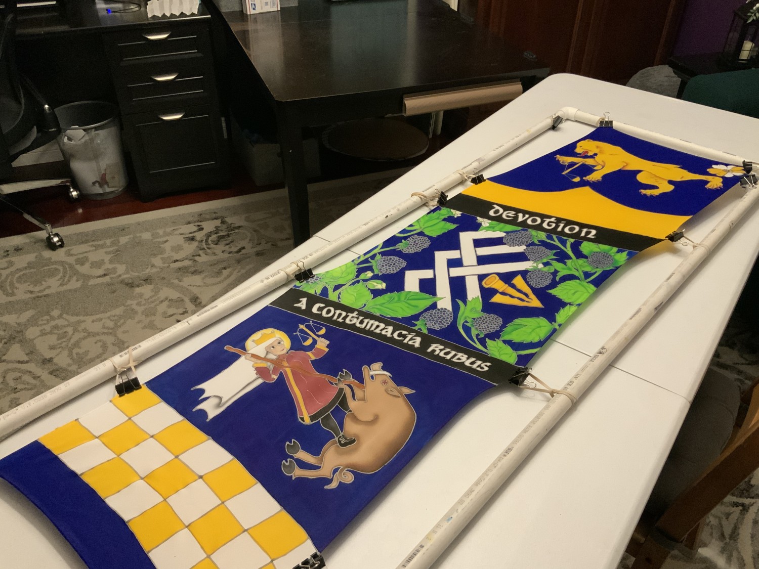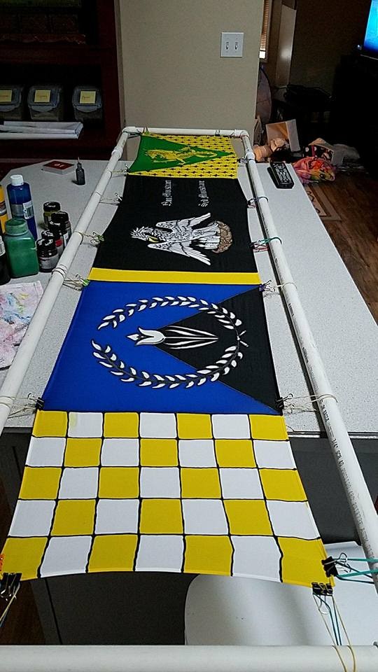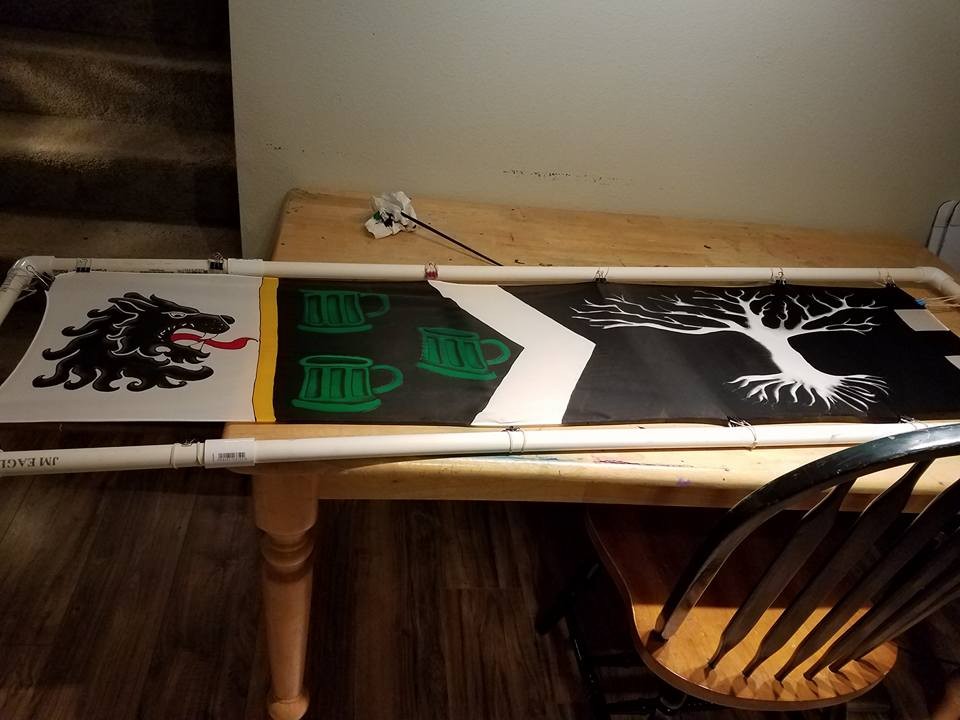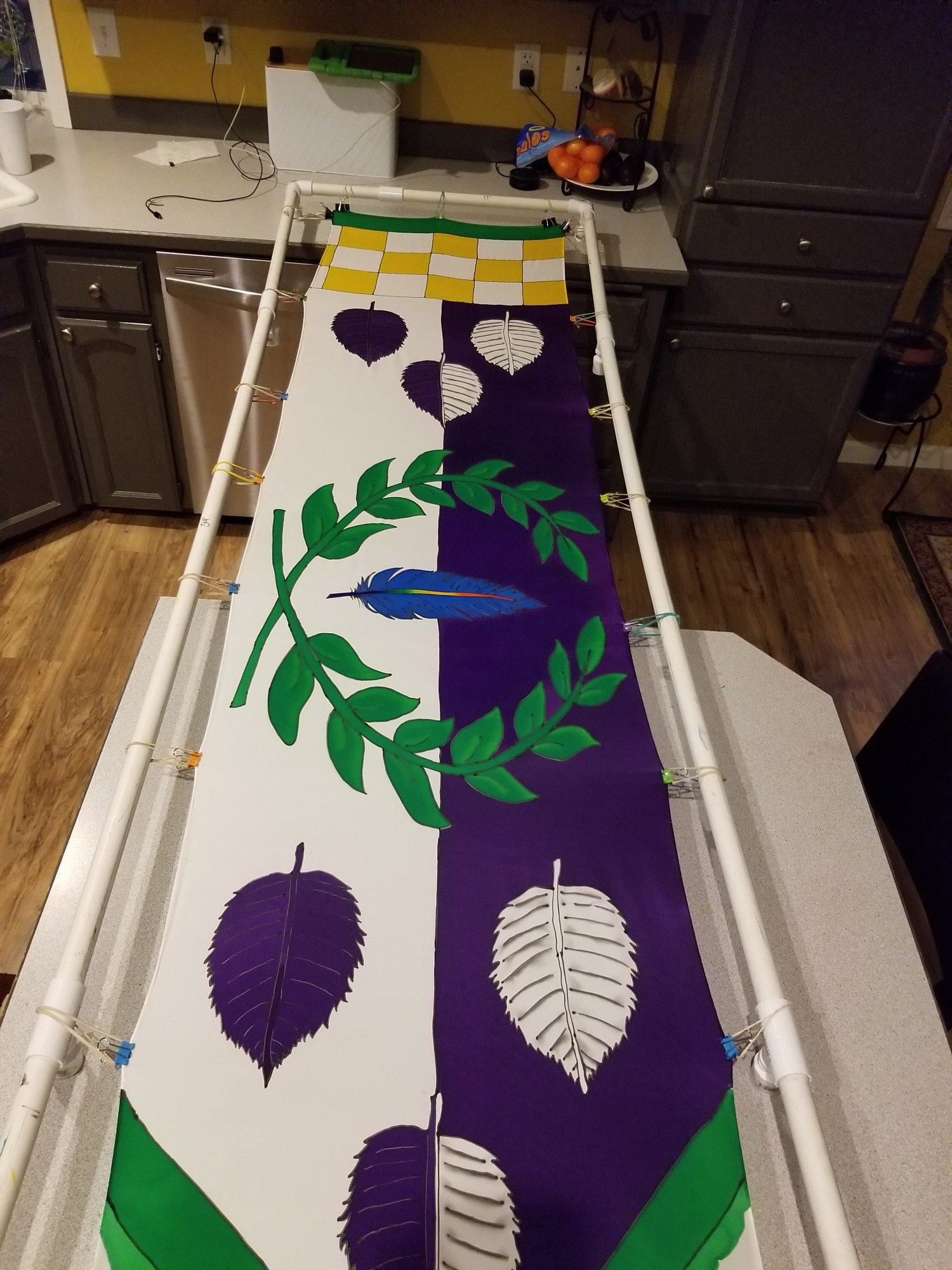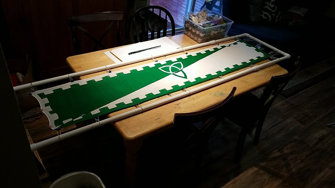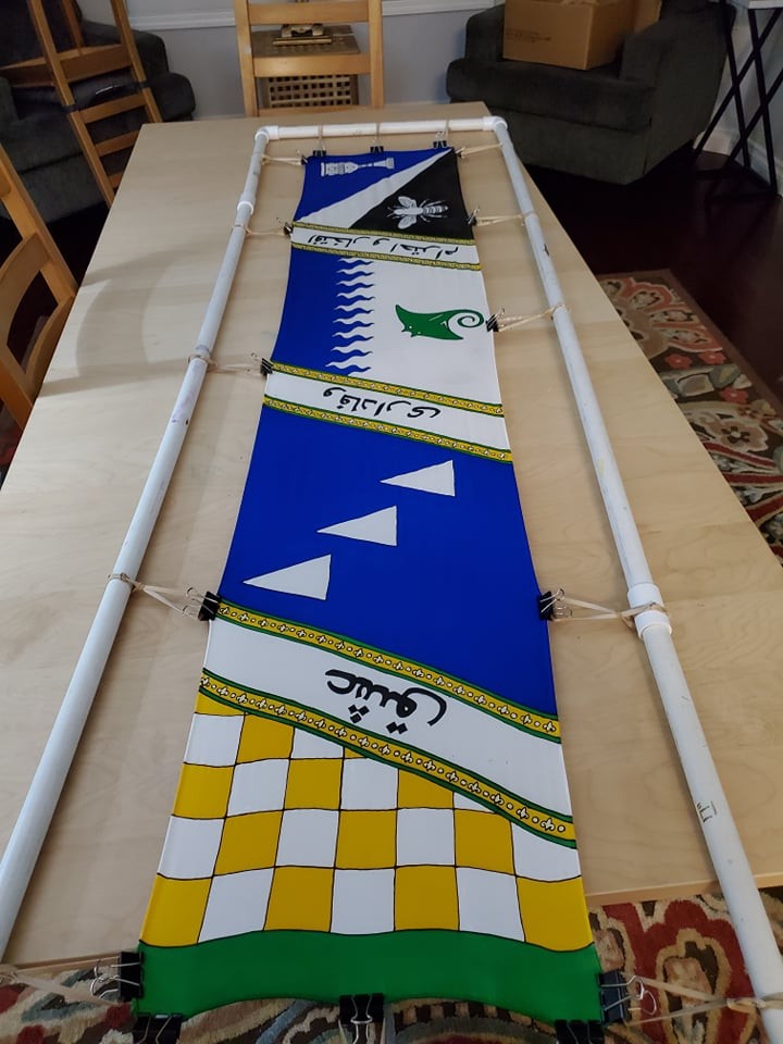 The banner is painted, heat treated and cotton cording ties are added to fly side.
