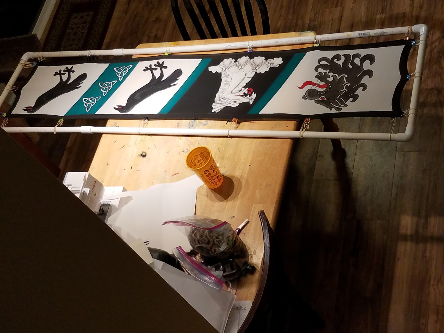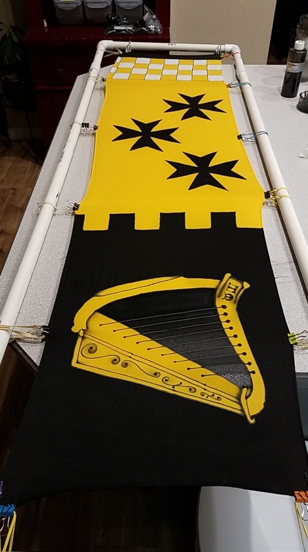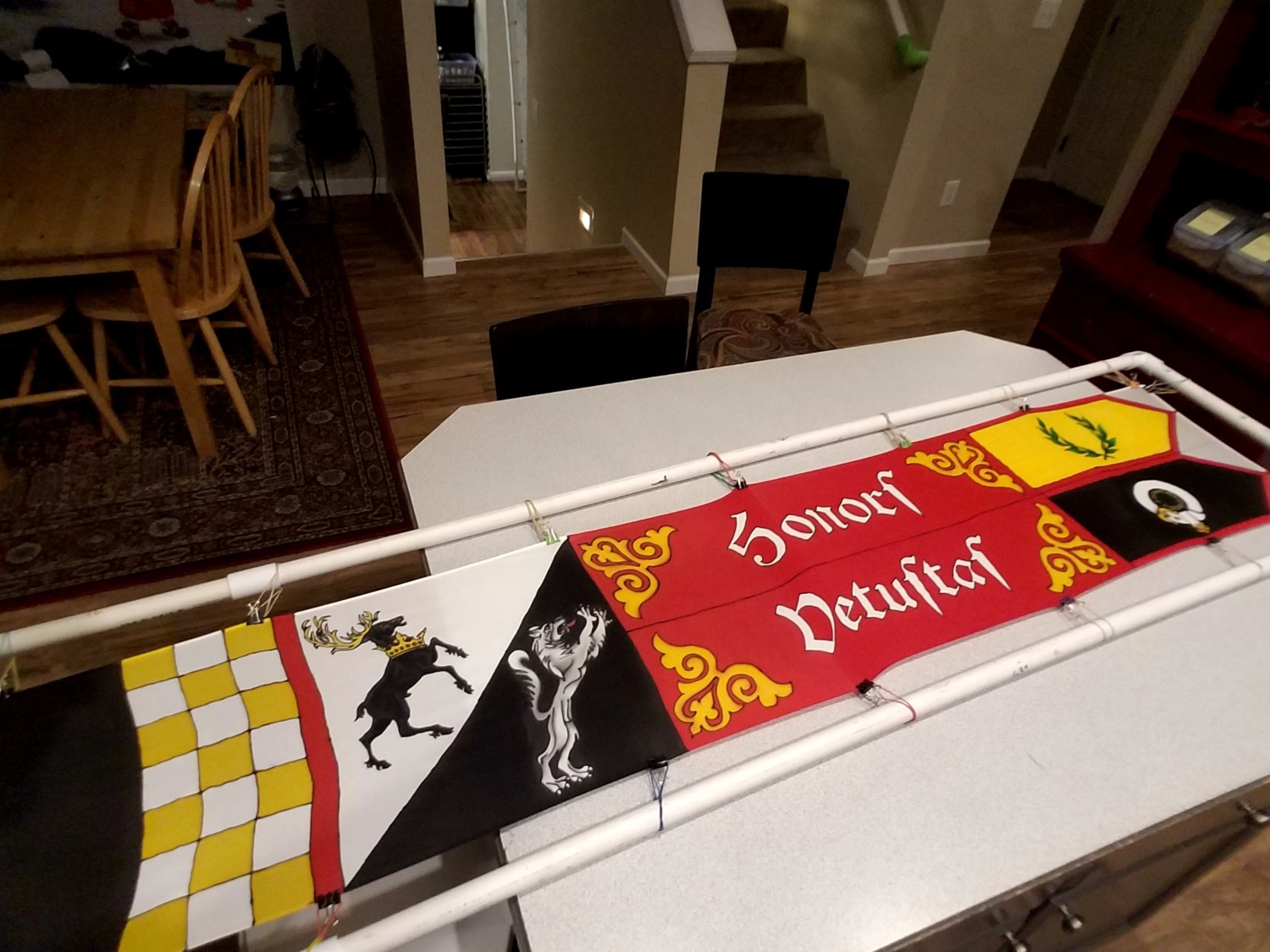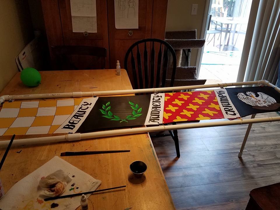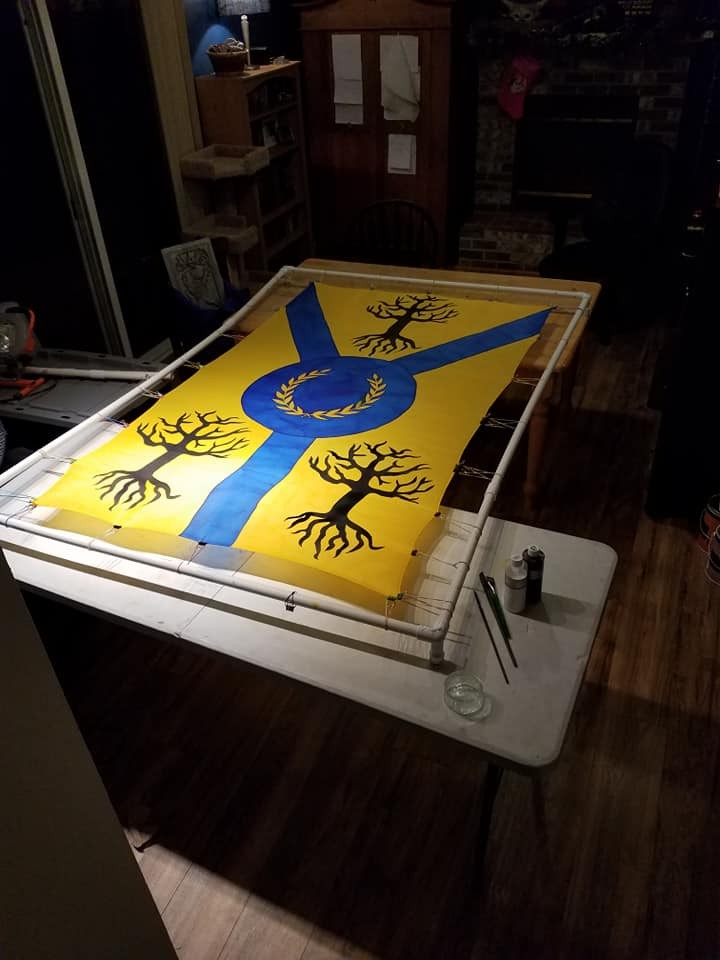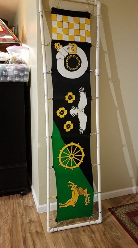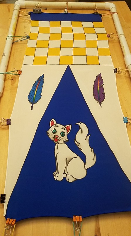 The banner is painted, heat treated and cotton cording ties are added to fly side.
