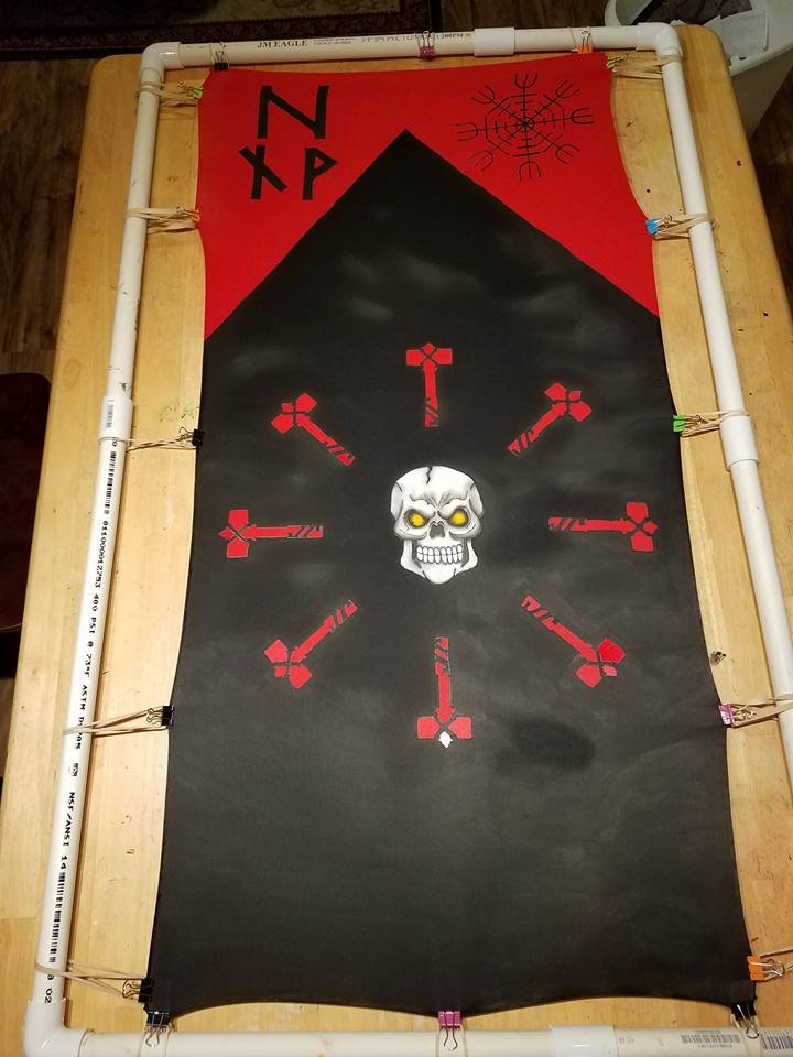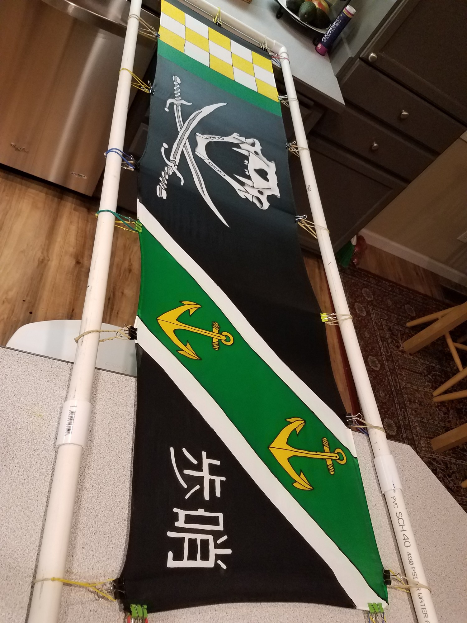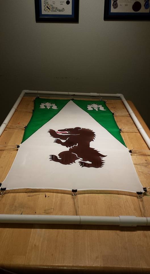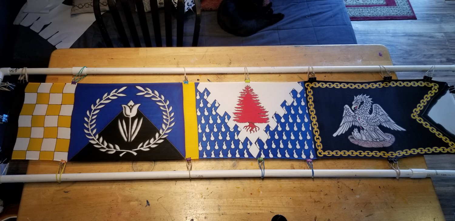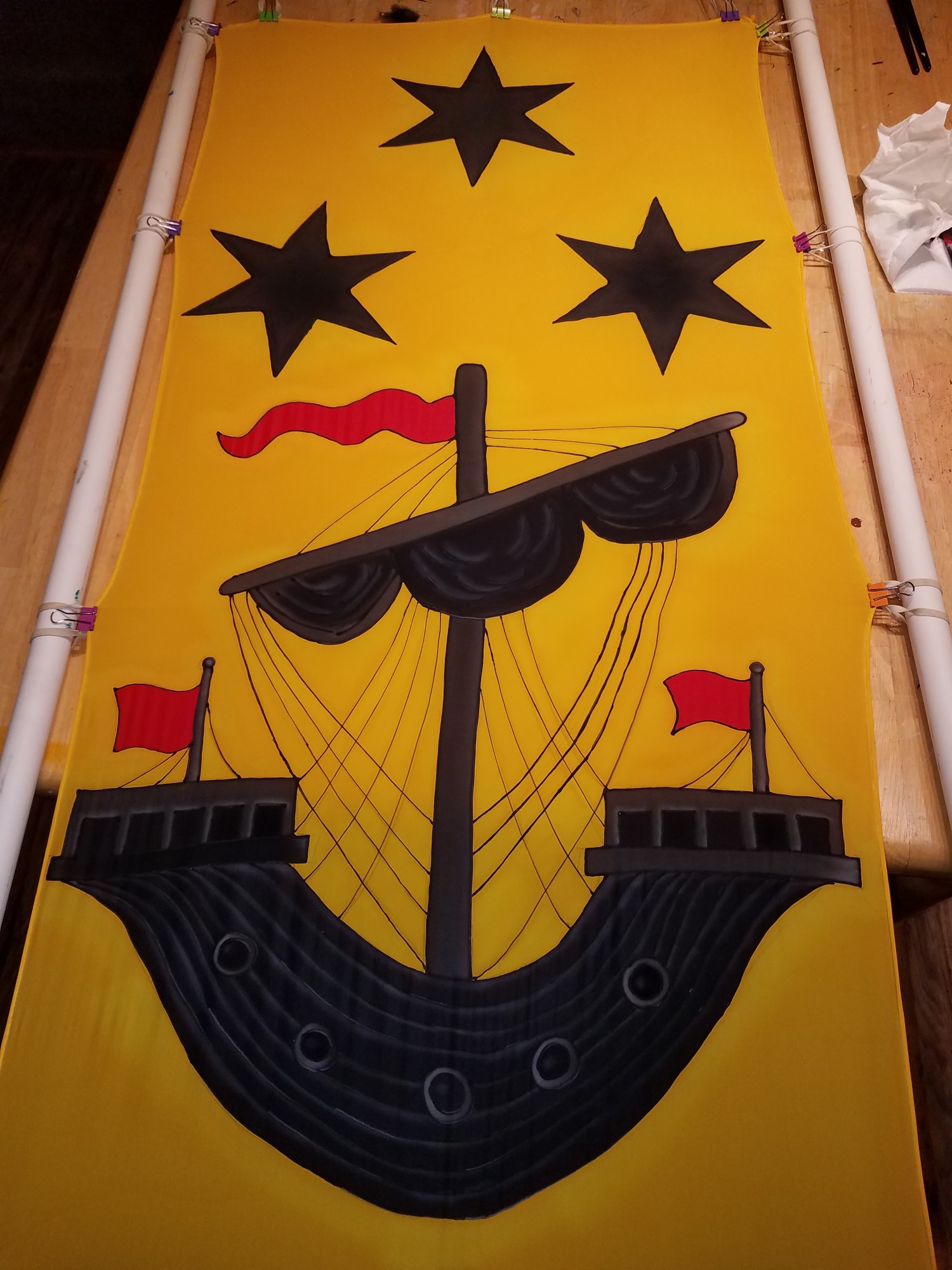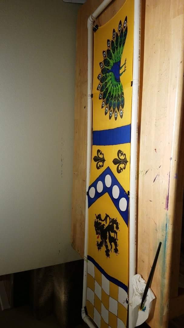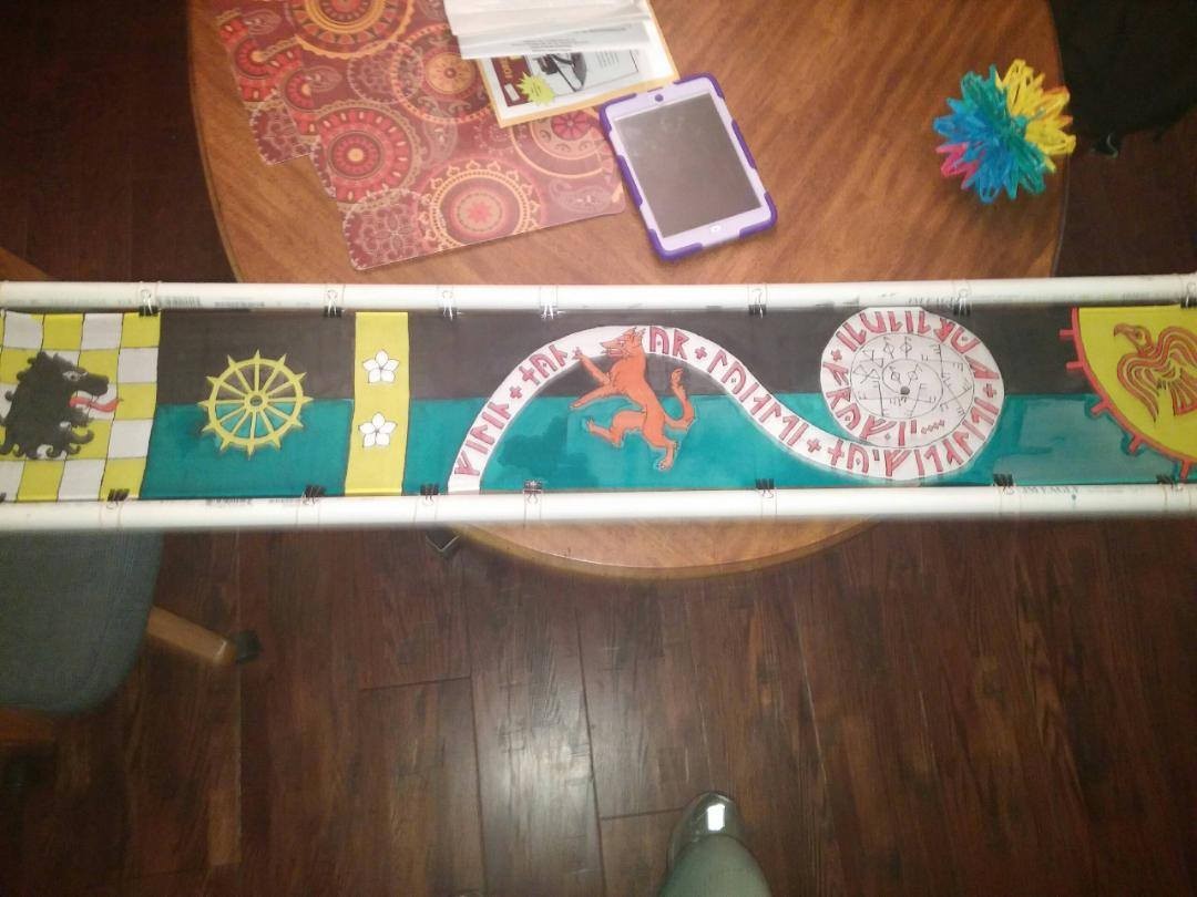 The banner is painted, heat treated and cotton cording ties are added to fly side.