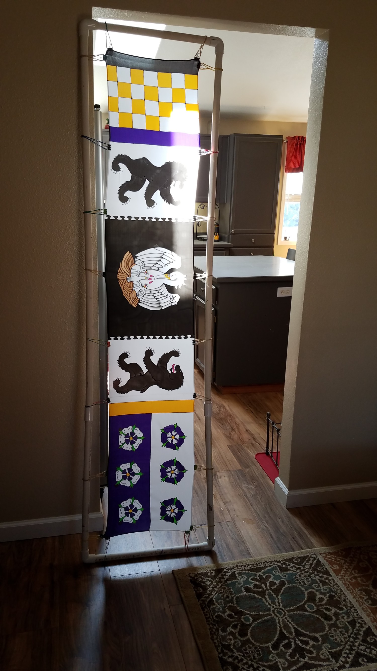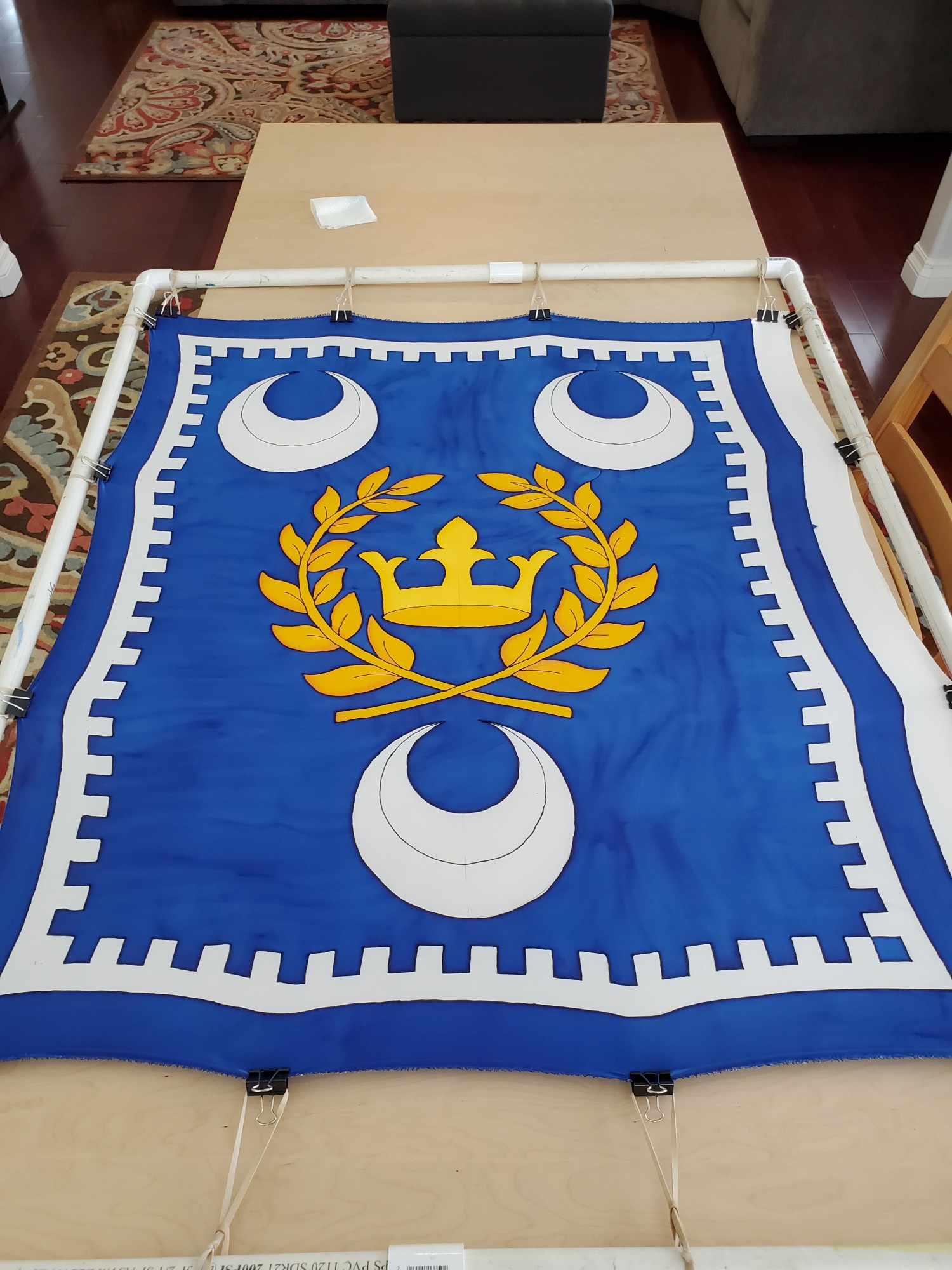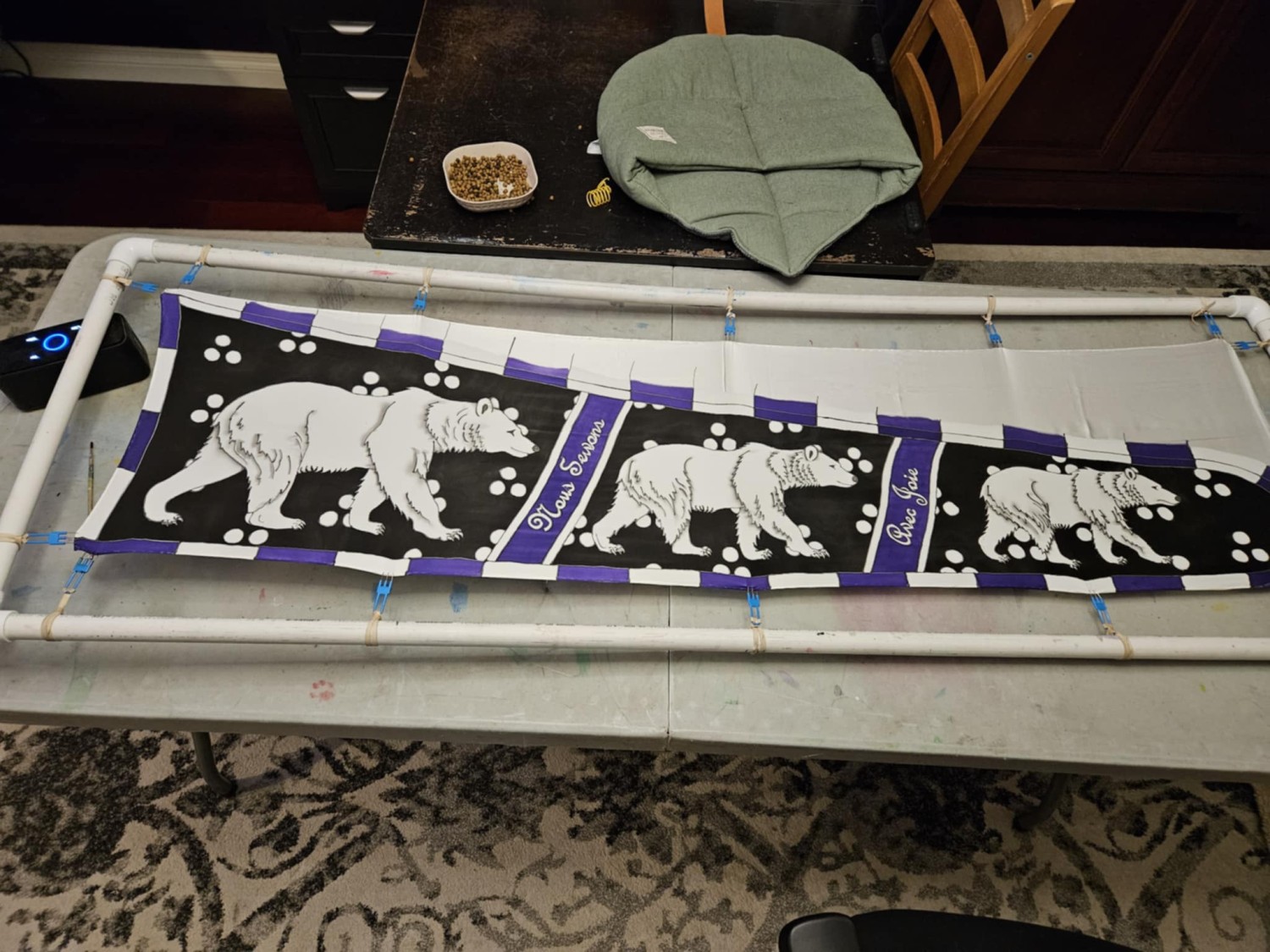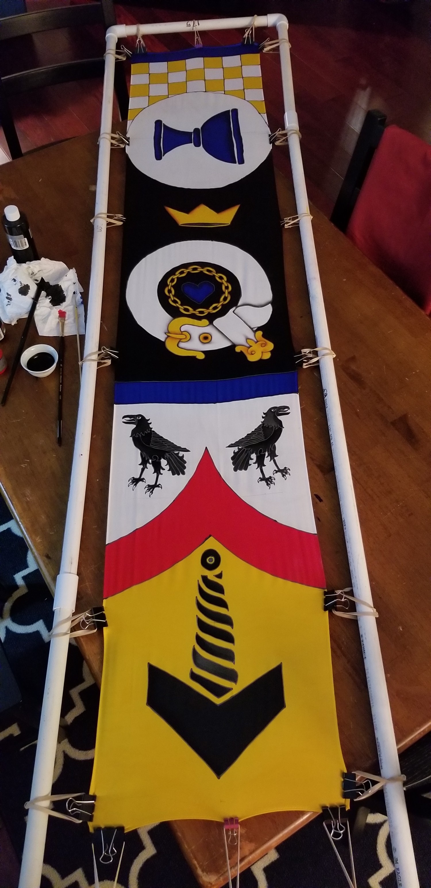The banner is painted, heat treated and cotton cording ties are added to fly side.