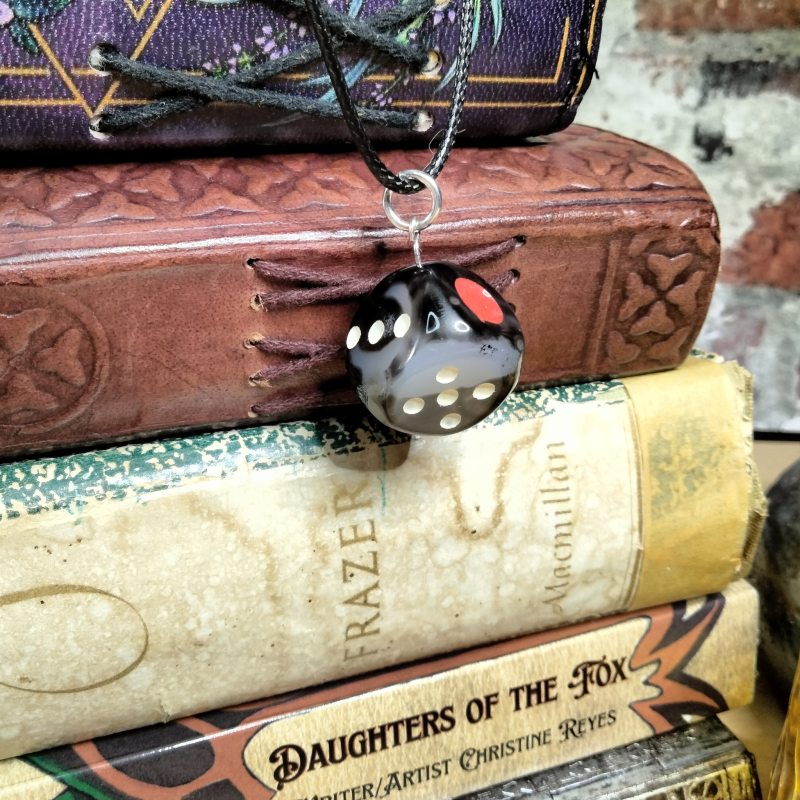 Black six sided dice carved from stone with painted pips. Comes on a simple black cord 18-20 inch adjustable. Sure to be a favorite statement piece for the stylish gamer geek.