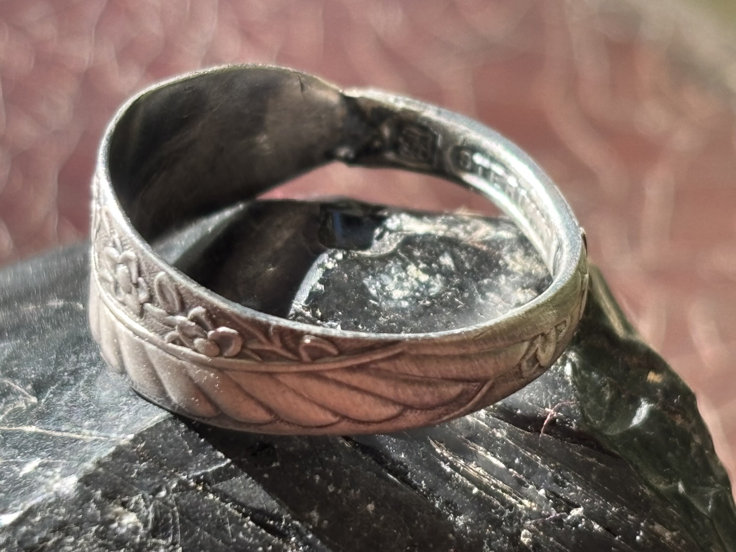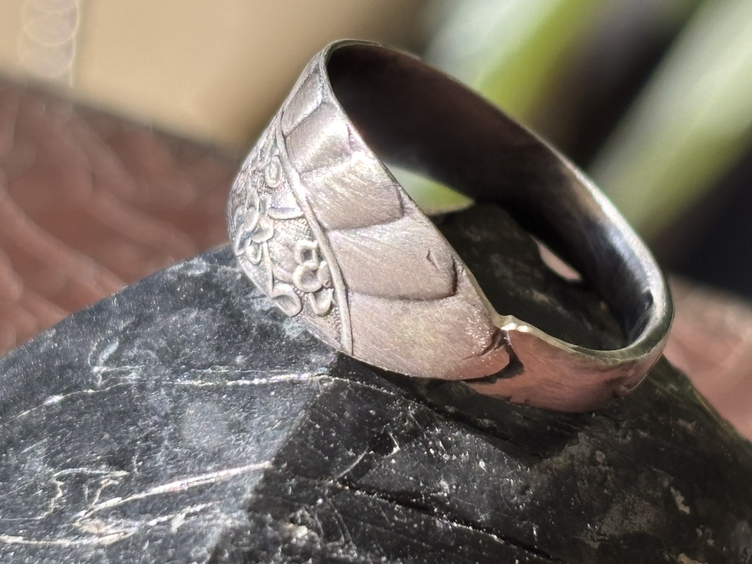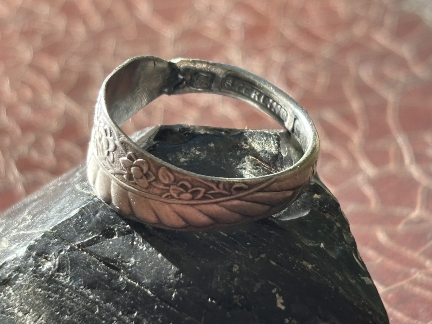 This lovely ring was hand made by me from a vintage sterling silver spoon. It features petite flowers and a stylized wing or feather motif. Slim and comfortable. Size 7 US. Will be delivered in a pretty gift box with an anti-tarnish tab.