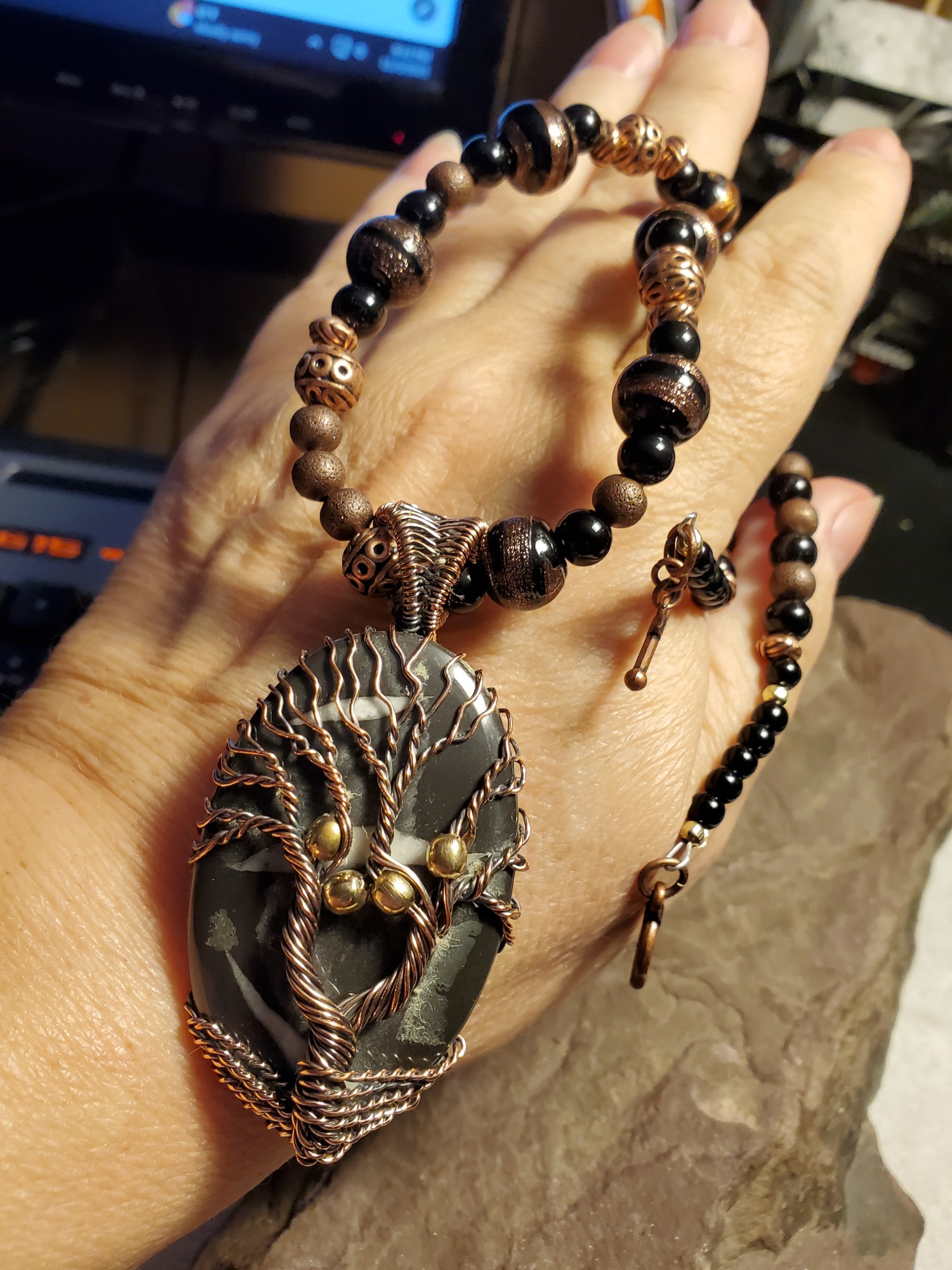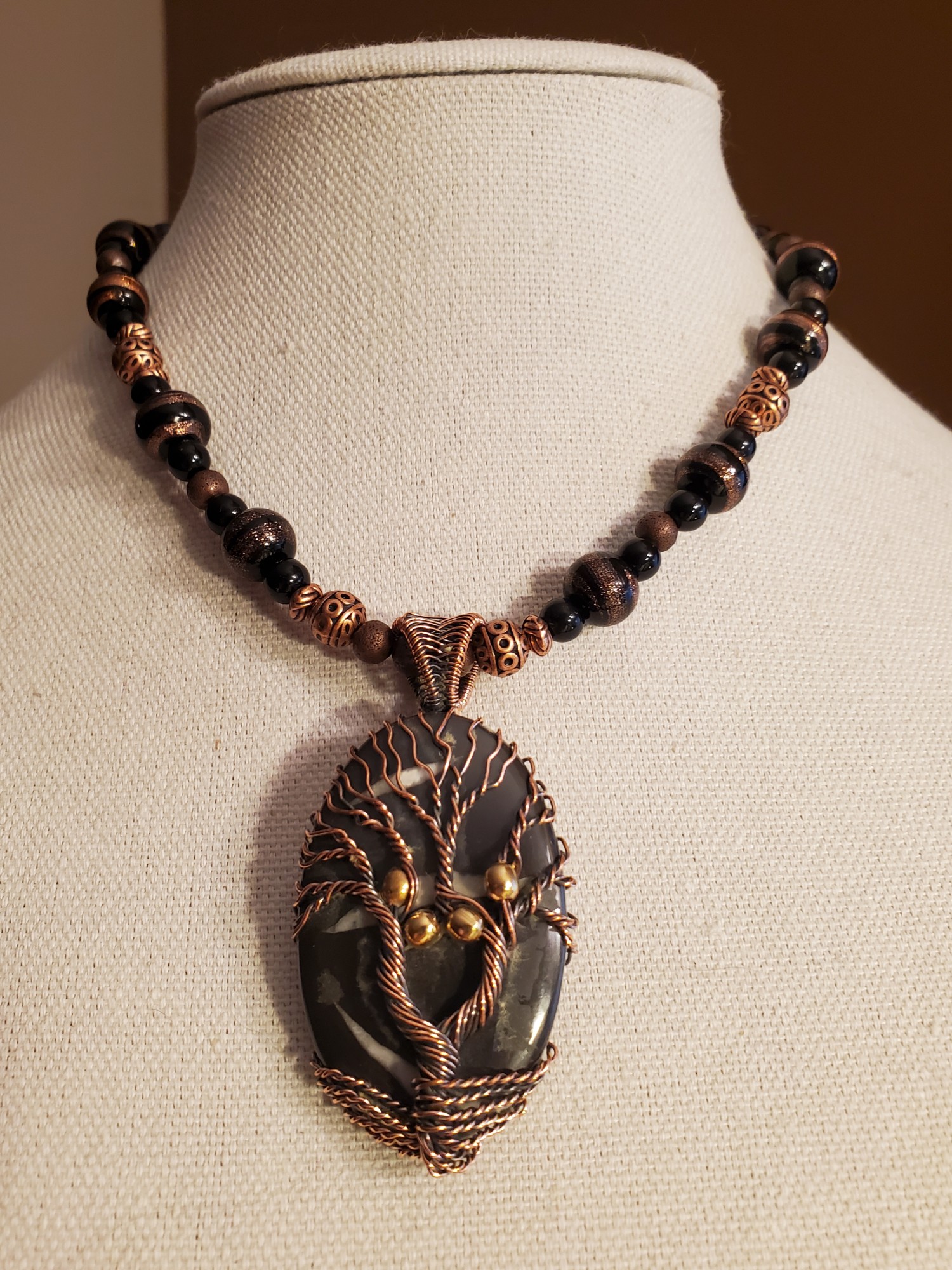 Dragon Septarian Gem in Copper , Onyx and Lamp work beads , 18" long, One of a Kind, can easily be extended