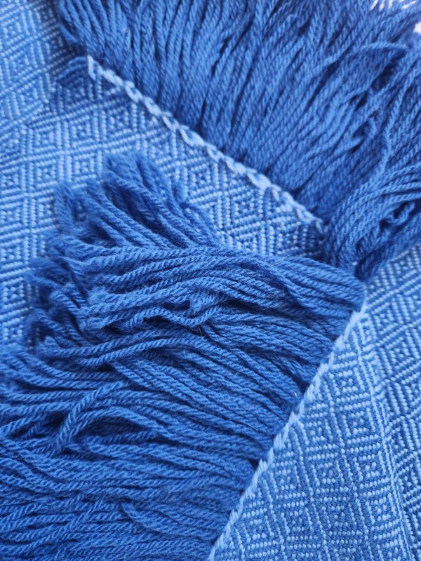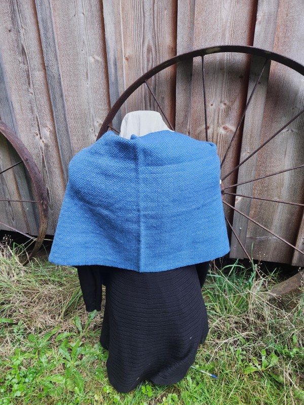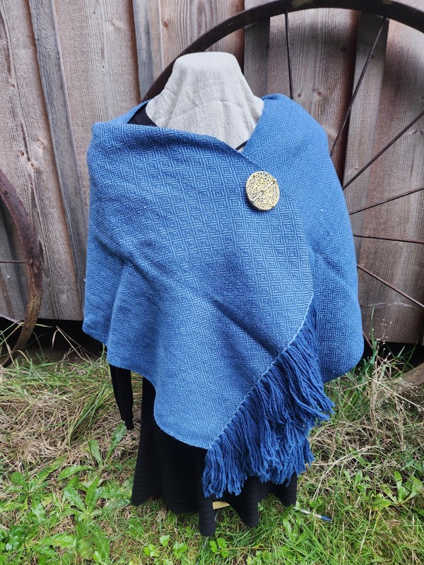 This pretty two tone blue shawl is handwoven by me, on a traditional floor loom in 100% wool. Thick wool makes for a cozy wrap on cool days or evenings around the fire. Blanket stitch on the fringe makes a nice decorative edging. Slight variations in weave may be seen, due to being handwoven vs machine woven perfection.