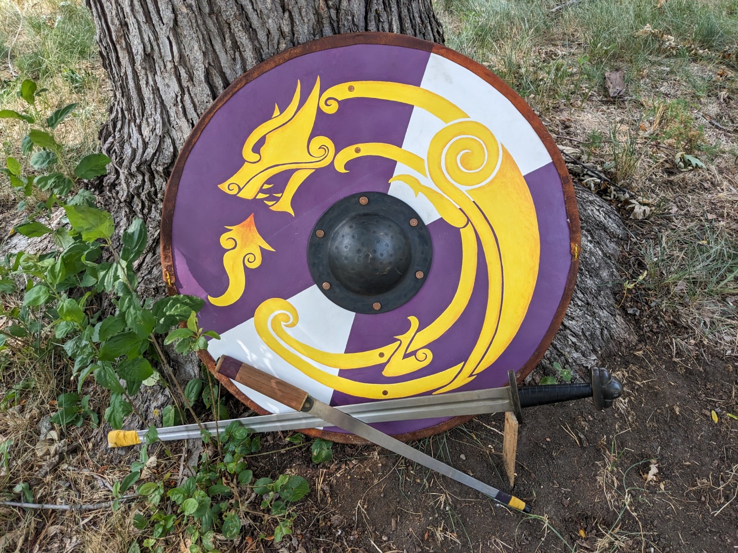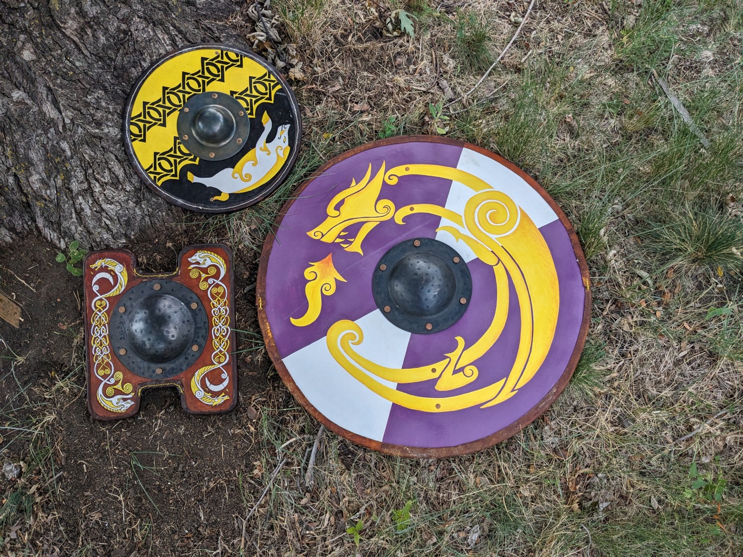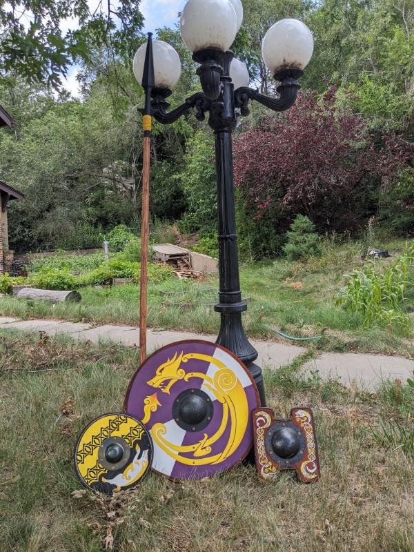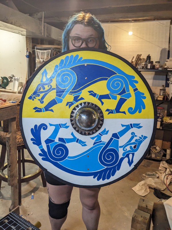 Early period shields for living history, reenactment, and SCA fencing/cut and thrust. These shields are made to closely resemble early period shields down to construction methods and materials with a few modern touches for longevity in our sport. Made of quarter inch birch plywood, I face my shields on both sides with both canvas (your choice of cotton or linen) and alum tanned leather, and then trim them in sewn or tacked rawhide. I carve long spar-style handles to your specifications and hand rivet these through metal bosses made by Therion Arms, which can be satin or polished steel, gun blued, or hot-brassed and sealed with renaissance wax, or painted any color of your choice. I then paint both faces with a flat coat of latex house paint and clear coat for sun damage longevity vs historic egg tempura and add the design of your choice to the front face. This can be anything from historic simple geometric and spiral designs to early period interpretations of your registered SCA coat of arms. I have a large graphic lexicon of Pictish, Ringerike, Urnes, Manmen, Norman, Saxon and Frankish artwork to ground my intrepretations of heraldic art in a pre-heraldic context using real historic designs from standing stones throughout the Iron, Migration and Viking Ages of Northwestern Europe.