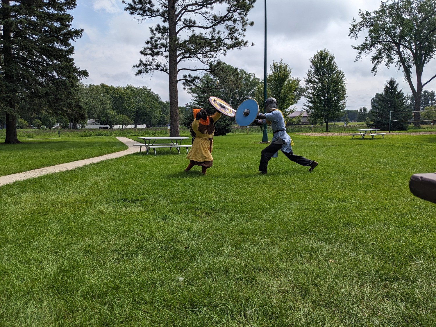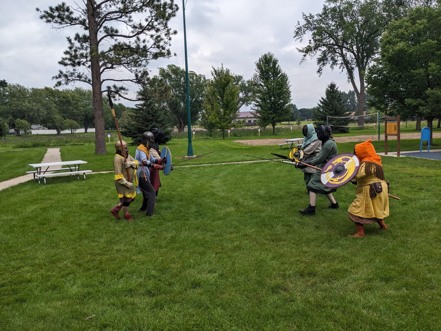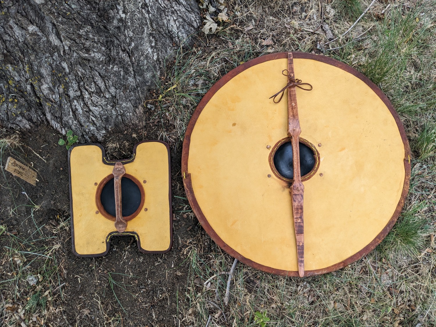 Early period shields for living history, reenactment, and SCA fencing/cut and thrust. These shields are made to closely resemble early period shields down to construction methods and materials with a few modern touches for longevity in our sport. Made of quarter inch birch plywood, I face my shields on both sides with both canvas (your choice of cotton or linen) and alum tanned leather, and then trim them in sewn or tacked rawhide. I carve long spar-style handles to your specifications and hand rivet these through metal bosses made by Therion Arms, which can be satin or polished steel, gun blued, or hot-brassed and sealed with renaissance wax, or painted any color of your choice. I then paint both faces with a flat coat of latex house paint and clear coat for sun damage longevity vs historic egg tempura and add the design of your choice to the front face. This can be anything from historic simple geometric and spiral designs to early period interpretations of your registered SCA coat of arms. I have a large graphic lexicon of Pictish, Ringerike, Urnes, Manmen, Norman, Saxon and Frankish artwork to ground my intrepretations of heraldic art in a pre-heraldic context using real historic designs from standing stones throughout the Iron, Migration and Viking Ages of Northwestern Europe.