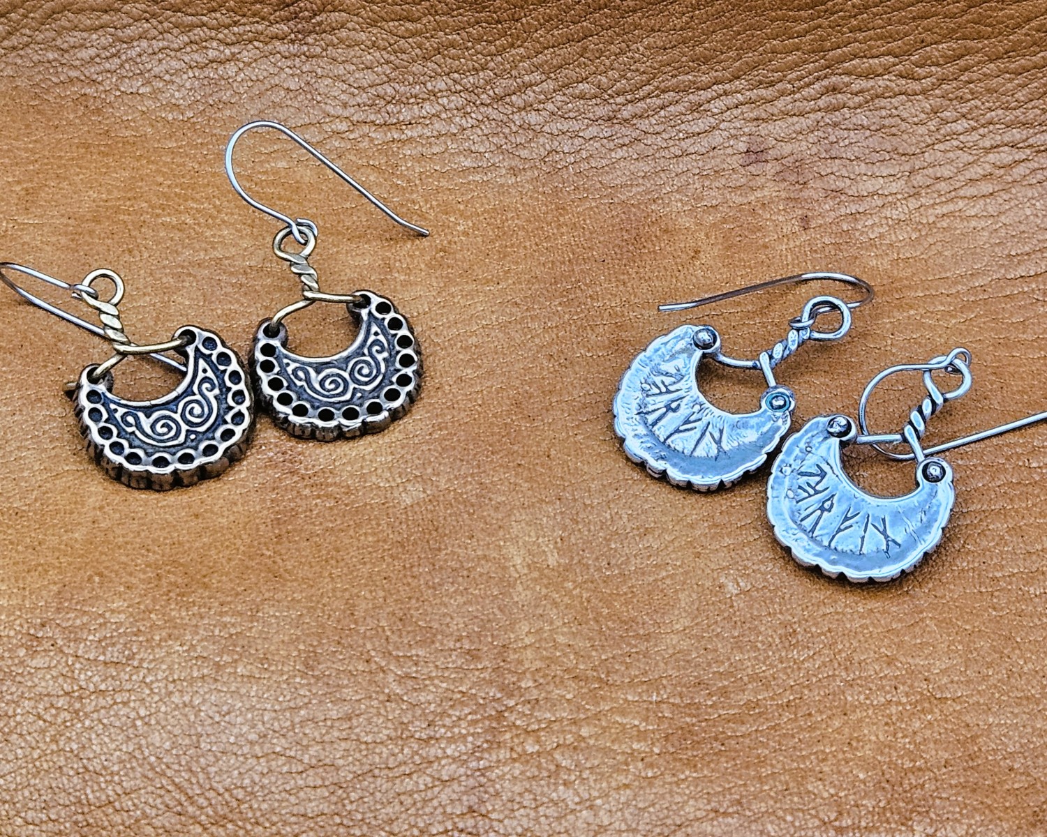 Description: Crescent-shape earrings from (?) in bronze or solid sterling silver with surgical steel ear wires.