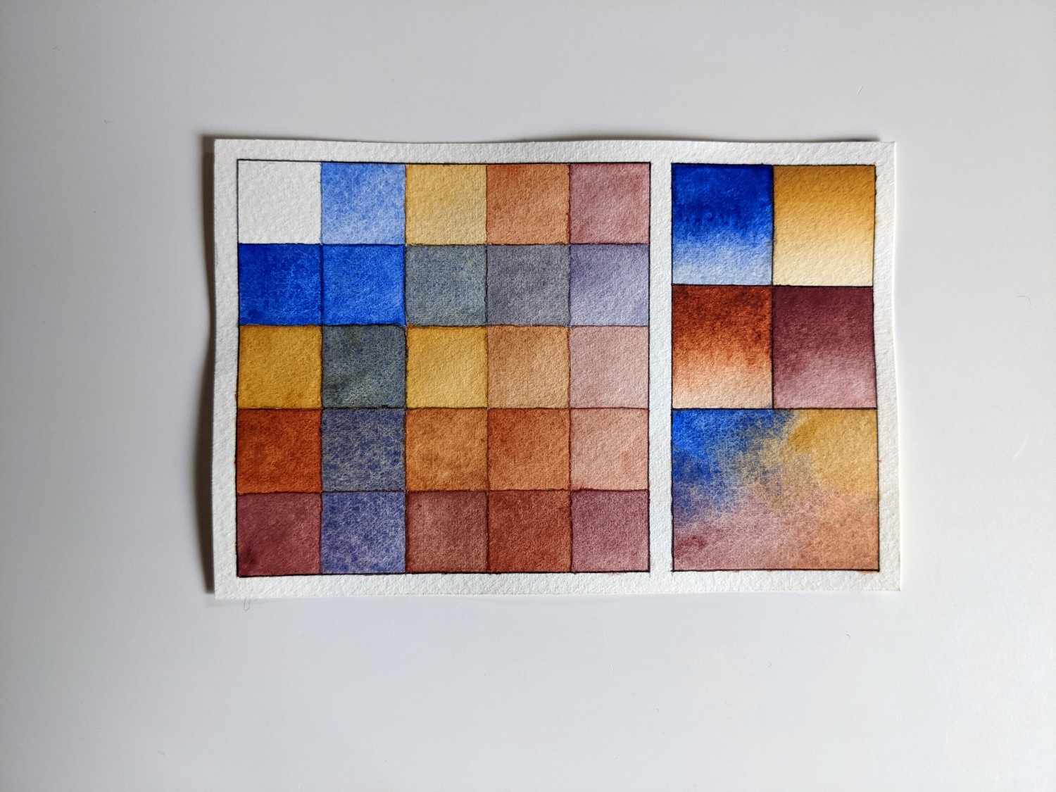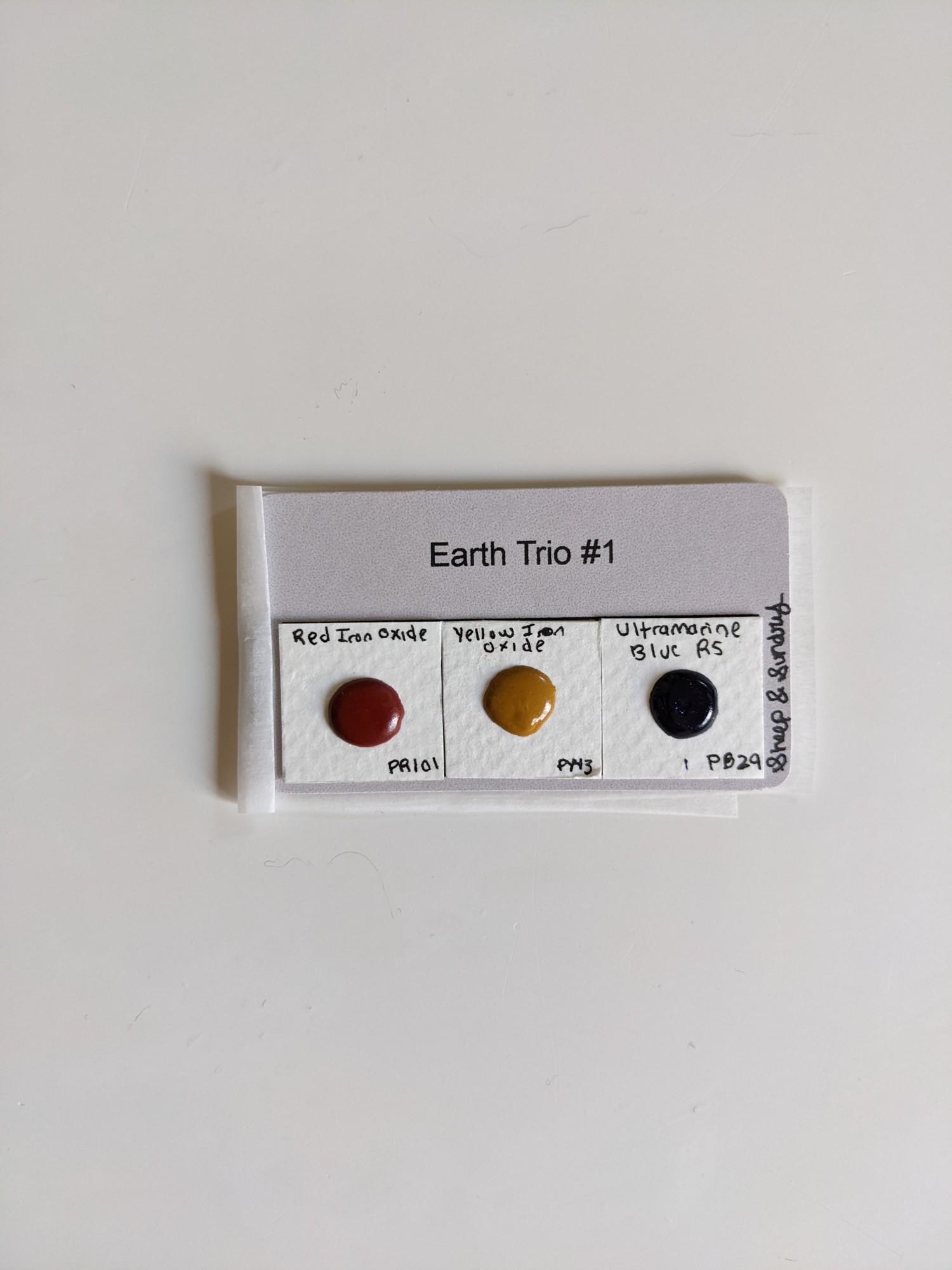 This set includes Ultramarine and iron oxide handmade paint dots. The ultramarine blue is a granulating paint and creates interesting textures on it's own and in mixes. These are the same paints as in the Earth Primary set, minus the burnt sienna. Check out the mixing chart to see the variety of colors you can create with this set.