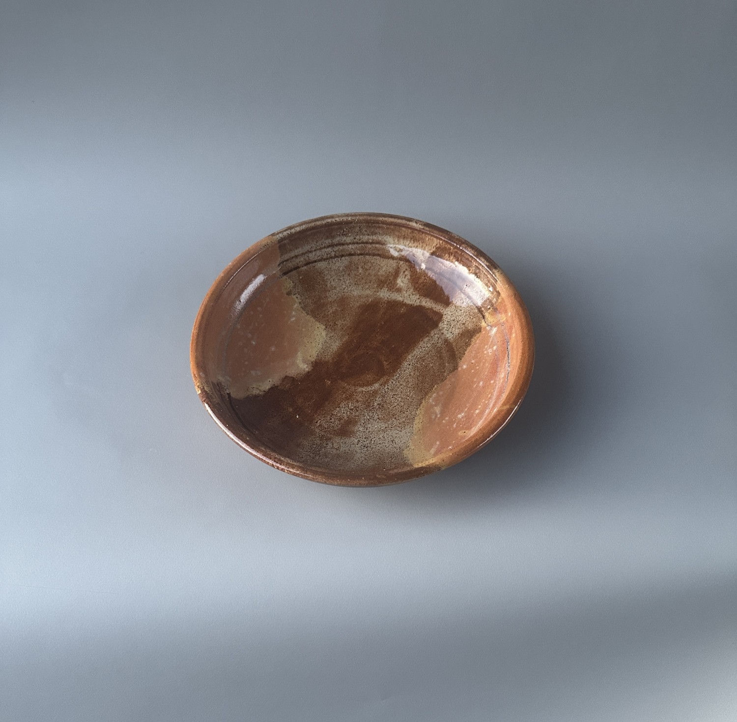 Perfect for serving, this brilliant 8 & 1/2 inch diameter 2 in. tall bowl, is glazed with safe glazes. The glazes appear to to run and mix together and create an appealing confluence of medium brown and tan. These glazes are combined in safe, permanent colors although they look like they are moving. Every vantage point is different, there will never be another bowl exactly like this one.