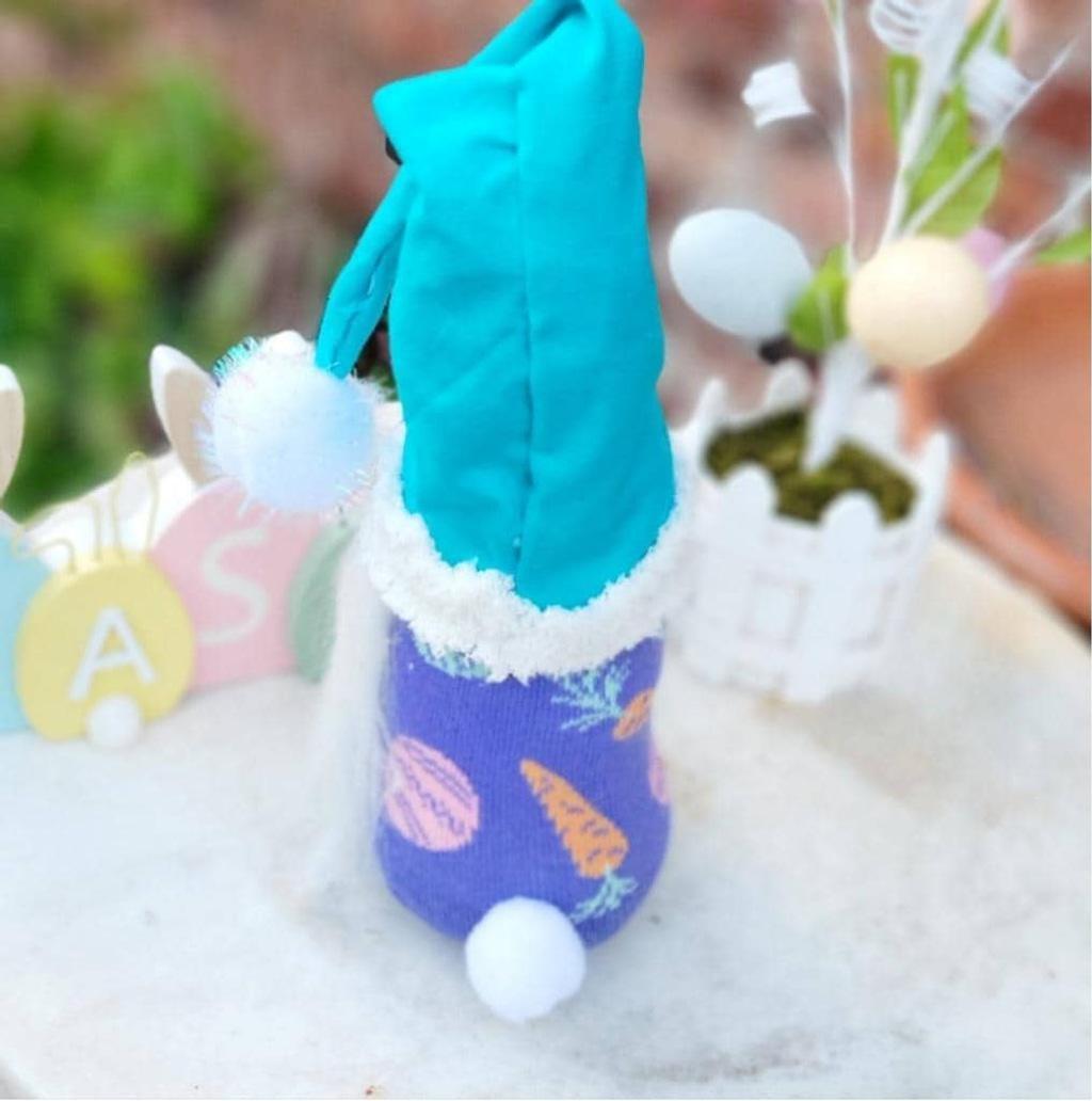 Meet: Hopfizz Bunnywink Burrow-dweller, lover of bright-colored flowers. This charming Easter gonk gnome with a bright blue hat and sparkly pom pom on the tip of his hat, wood nose, white beard, Easter egg outfit in multiple colors, and white pom pom bunny tail. Perfect for festive decoration, tier tray decor, or Rae Dunn Collection. This adorable gnome measures approximately 10" tall body and 17" tall to the tip of his hat.