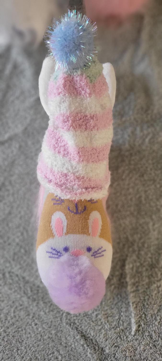 This adorable Easter bunny gonk gnome has a cute bunny outfit and long, poseable bunny ears, flowing pink beard, wood nose, and pink striped hat, with a large blue pom pom on the tip, and matching purple bunny tail. He measures approximately 12" tall and 18" to the tip of his ears.