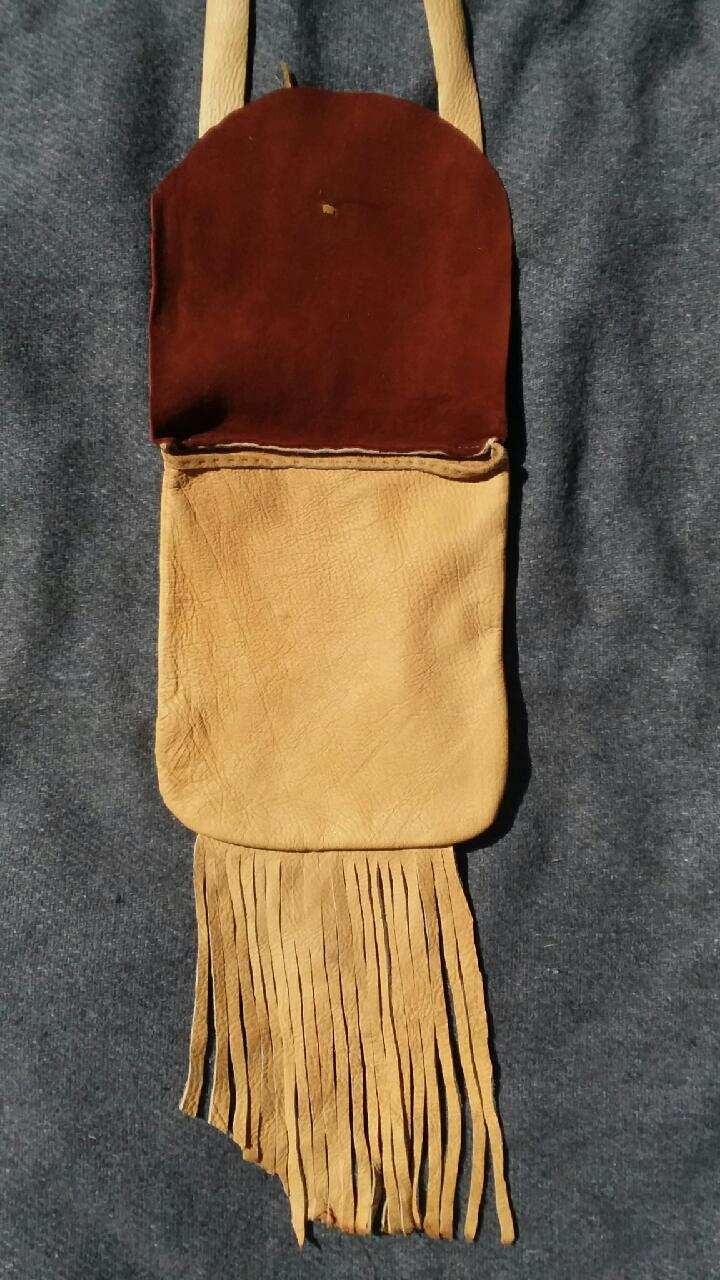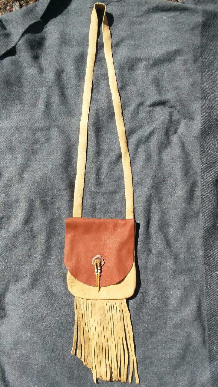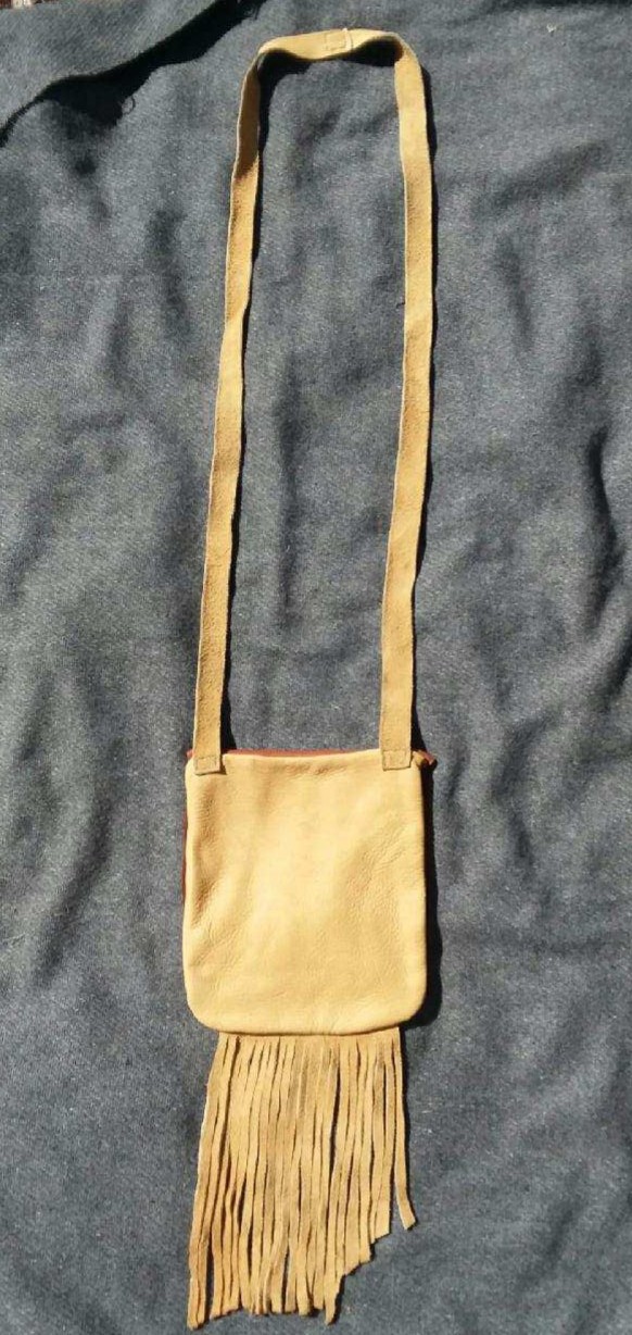 This unique pouch measures 7.5" wide by 8.5" long with 8" fringe. It is made of ultra-soft elk hide in two colors, a buttery light yellow and a chocolatey brown. The strap is stitched in two pieces with a total drop of 27". The front flap is decorated with a polished antler button and bone beads.