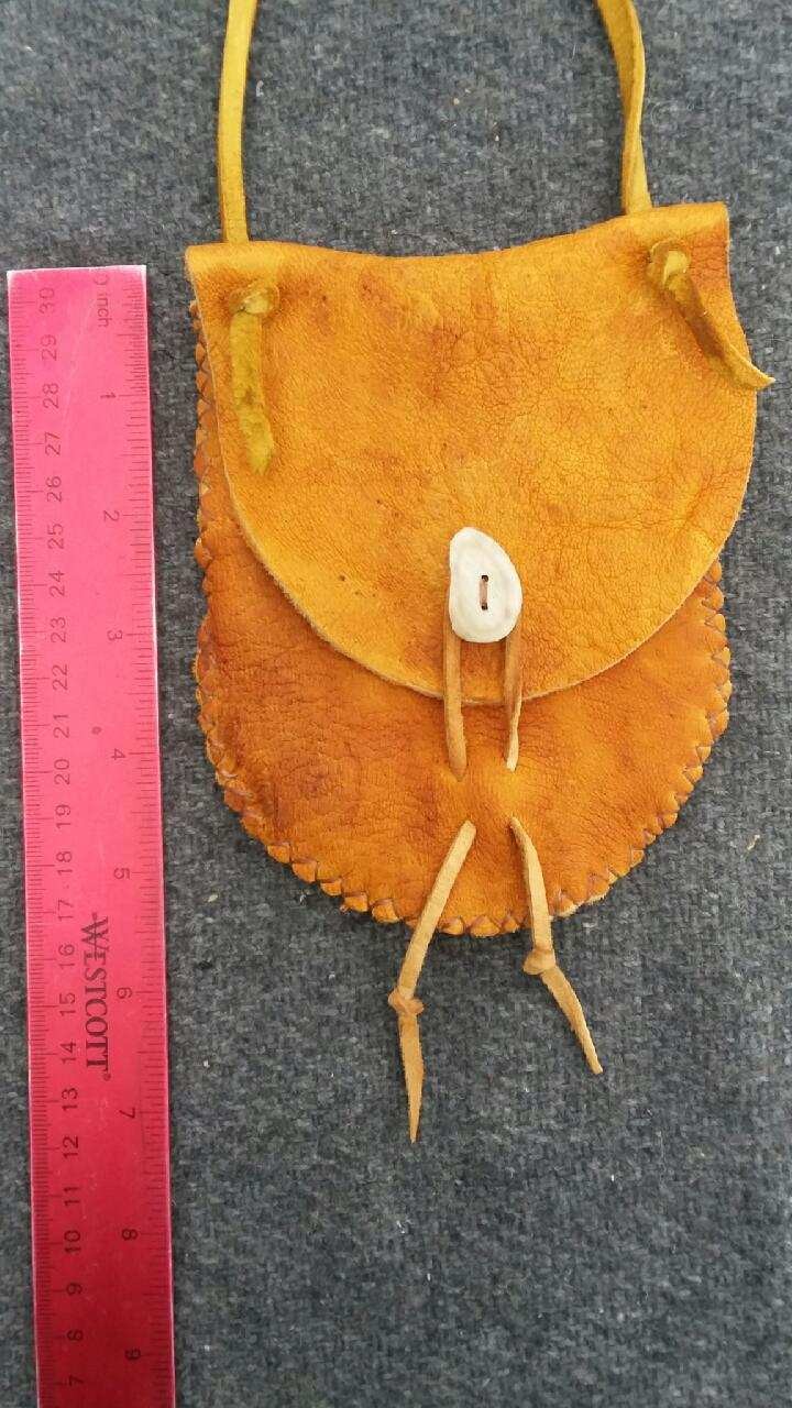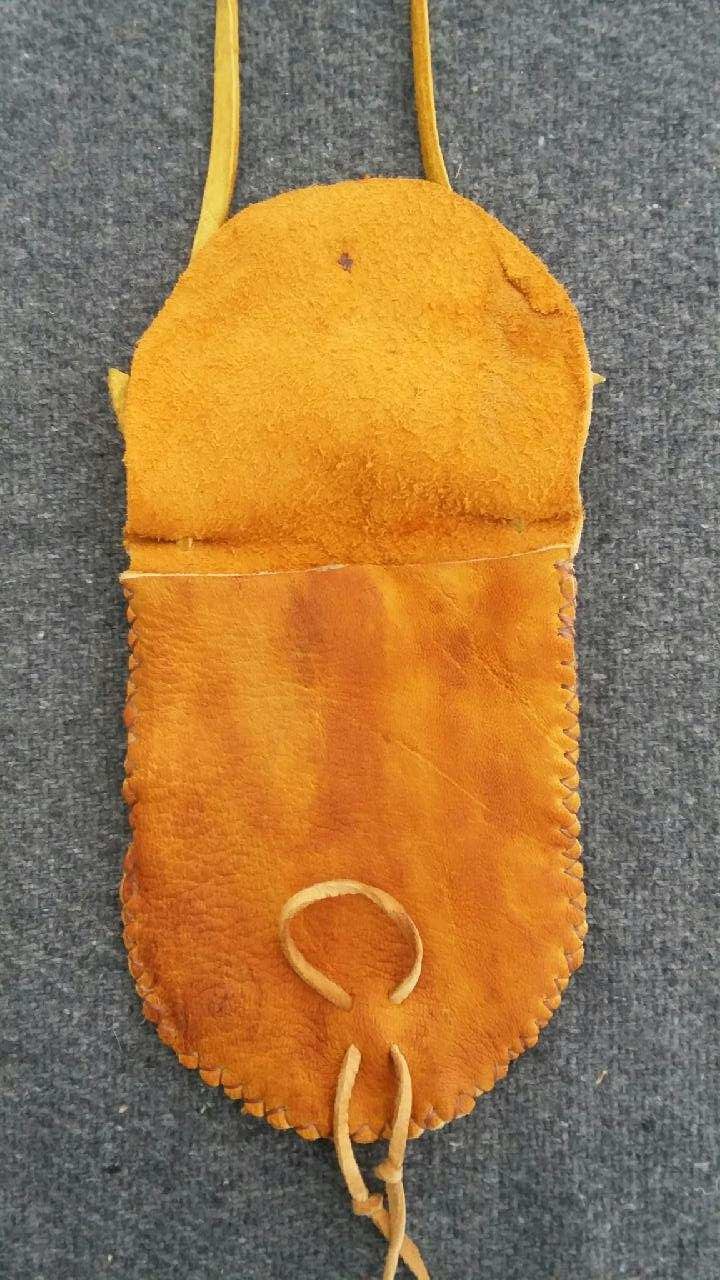 This is a small pouch handmade from a vintage Elk hide that is full of character! Pouch is stitched with sturdy artificial sinew. It is finished with a button-and-loop closure featuring a hand-cut antler button. Pouch is approx 4x5" and the leather strap has a total drop of approx 10". It can be worn around the neck or on a belt to keep your special small items close to you. Leather has been treated with a natural waterproofing compound which contributes to its vintage look.