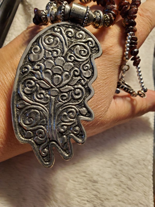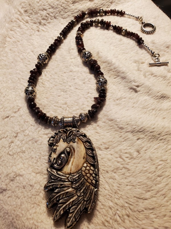 Epona - Natural Garnets in Tibetan Silver, Pendant Water Buffalo Bone in Sterling Silver , 20" long