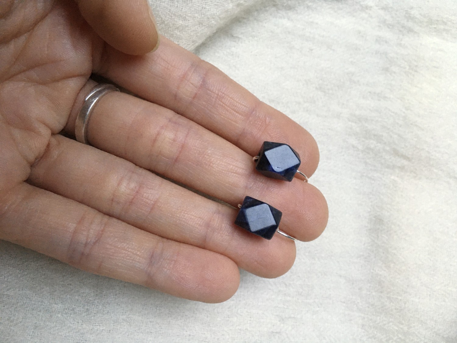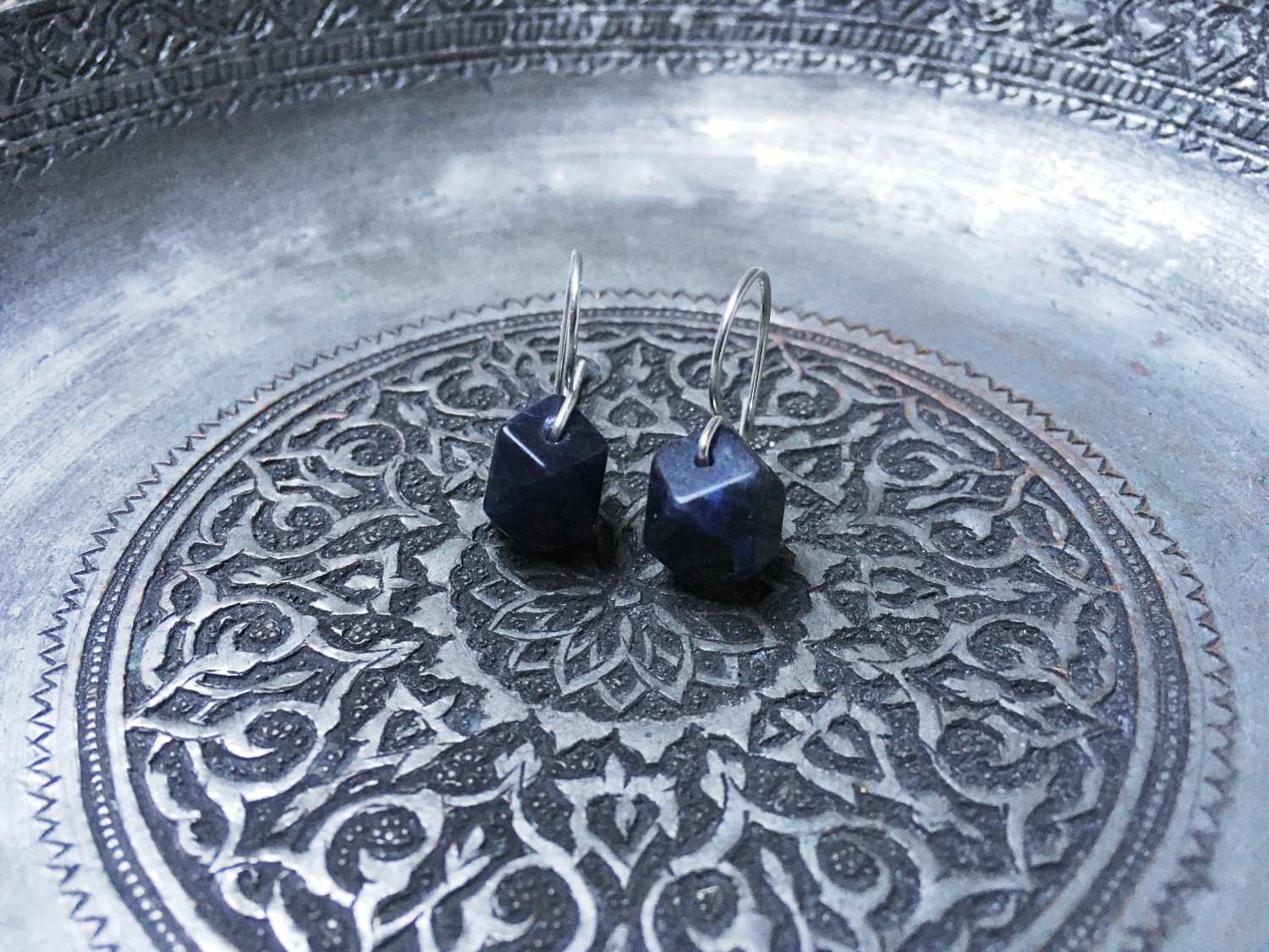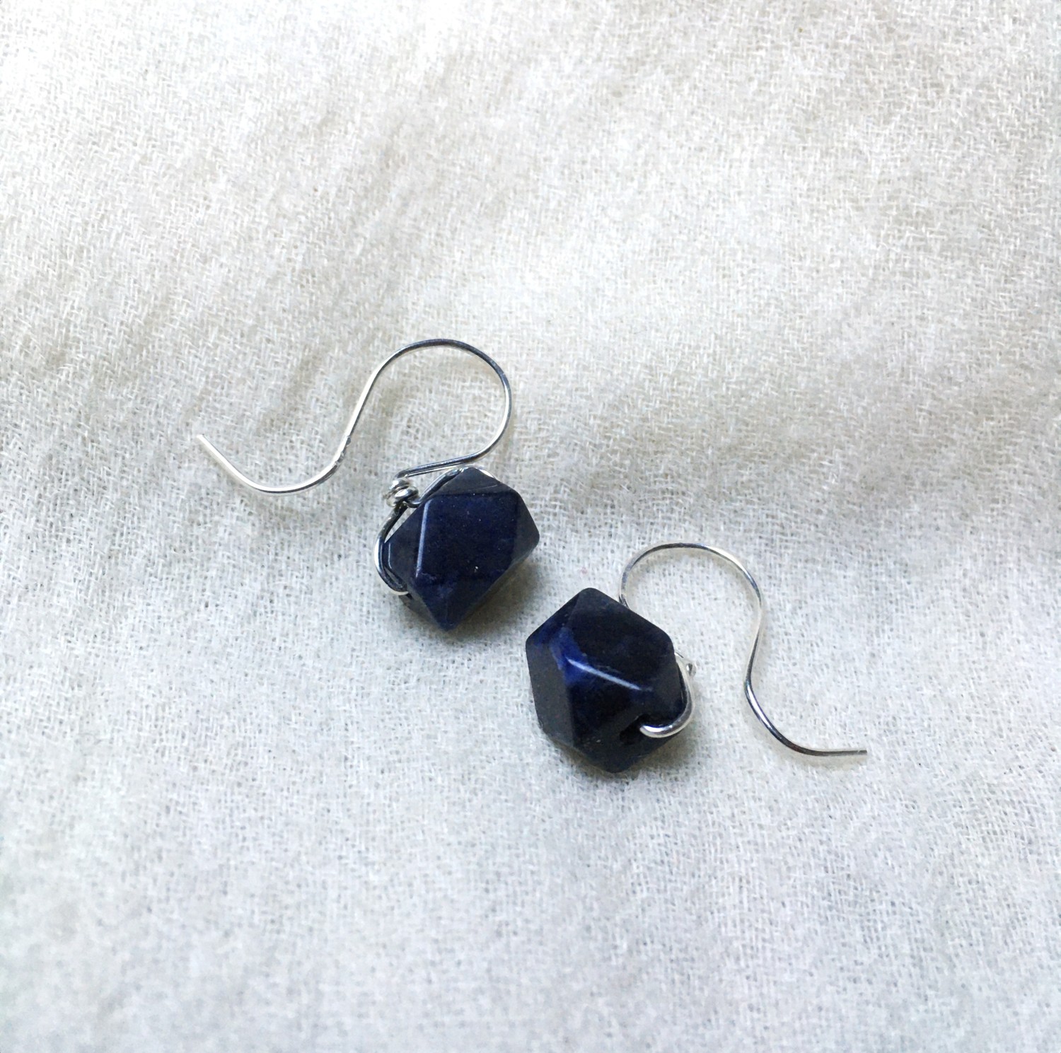 These earrings are based on Roman era earrings from Serbia, and made using 20 gauge sterling silver earwires and faceted square sodalite beads.
