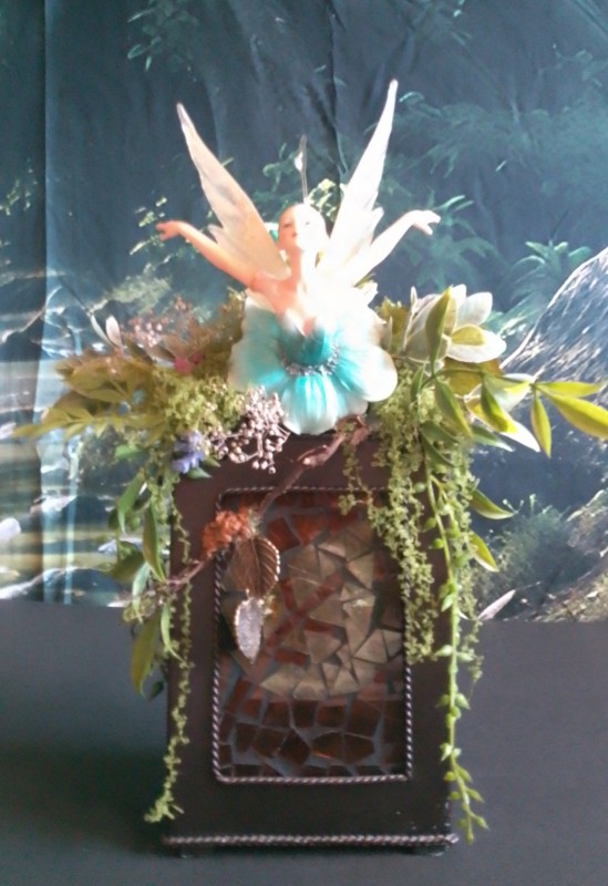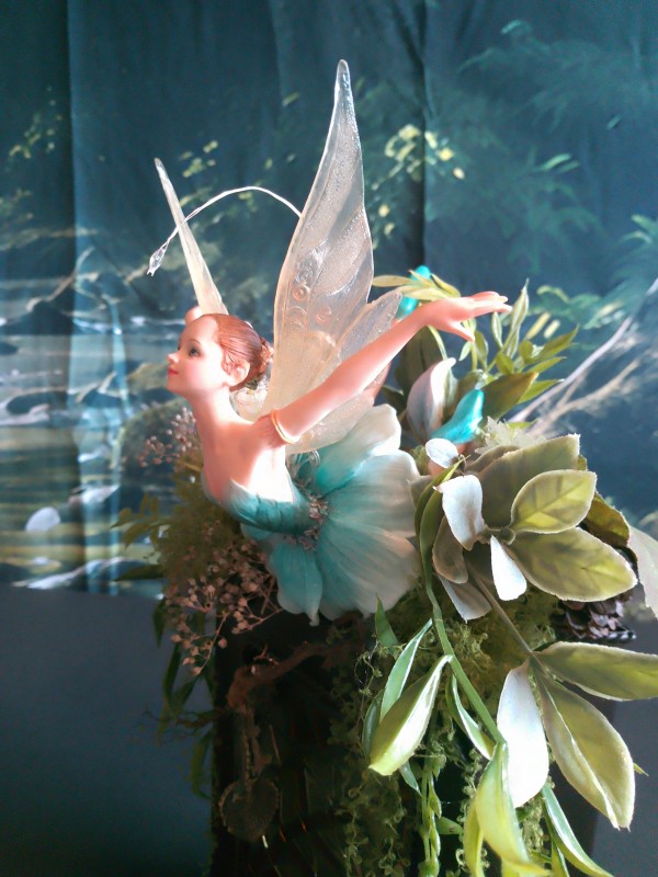 Features an authentic Faerie Glenn ceramic collectible faerie, beautifully displayed above lush artificial foliage.